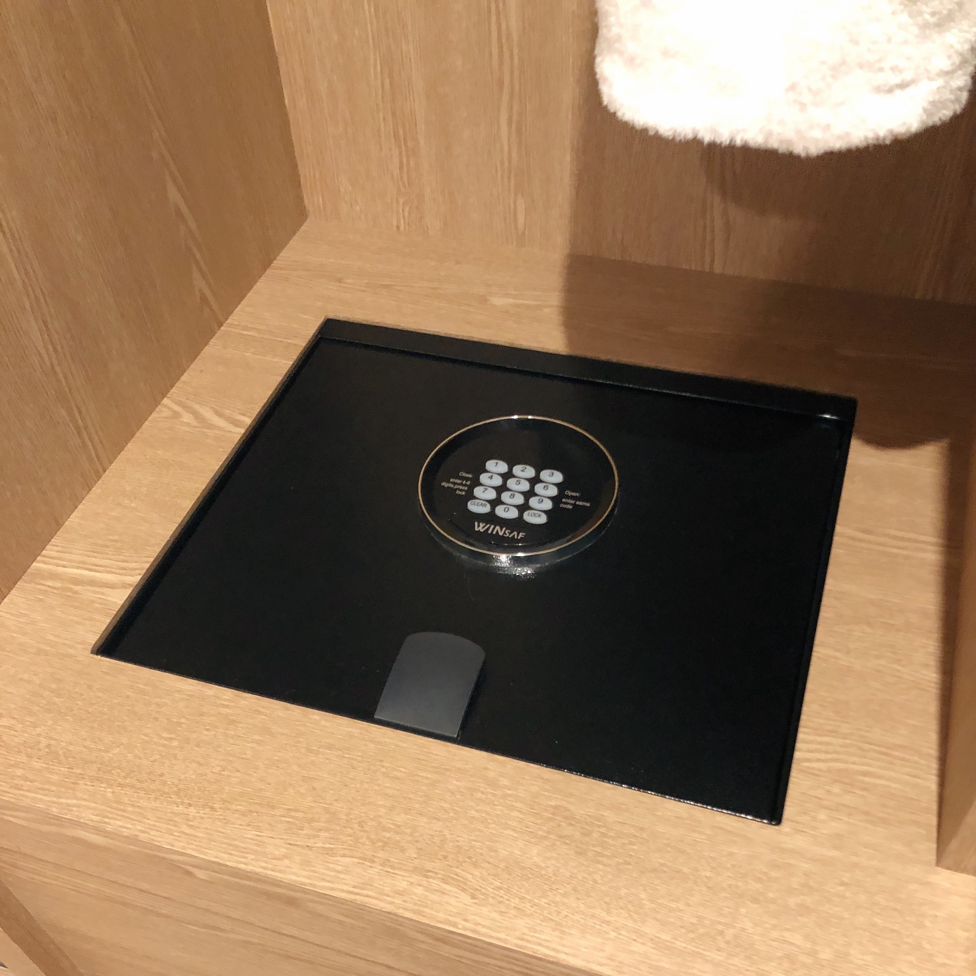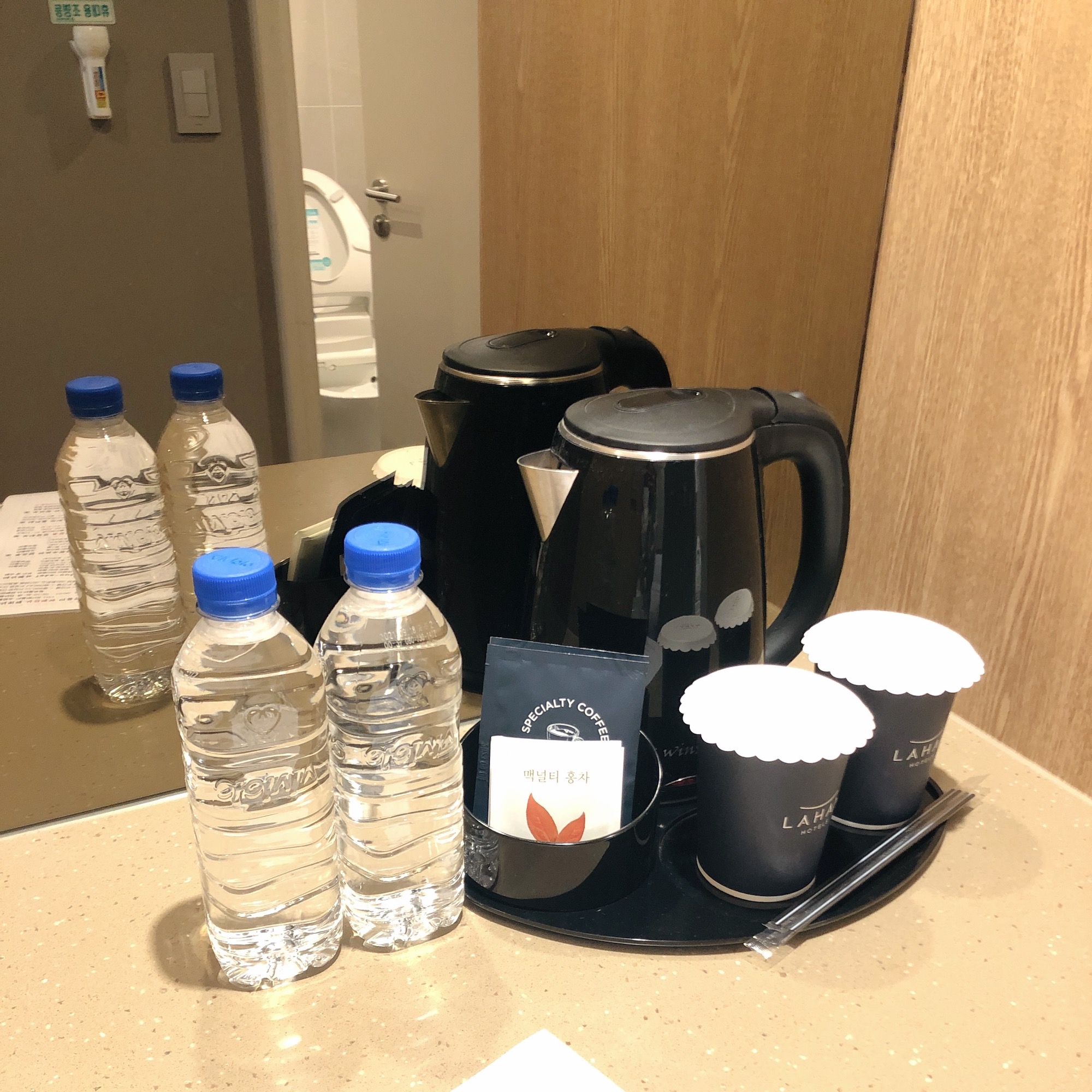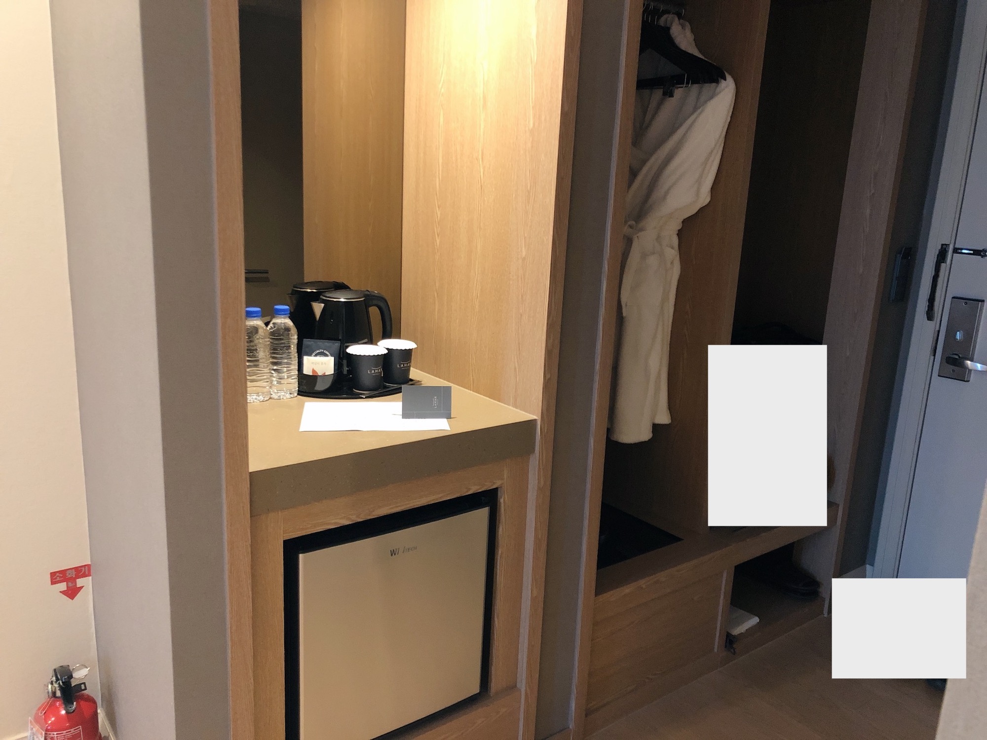 현관문 바로 옆으로는 냉장고, 옷장, 금고 등이 있고, 생수는 4병이 준비되어 있었다. 간단하게 차를 마실 수 있도록 커피포트와 컵, 빨대도 있었다.