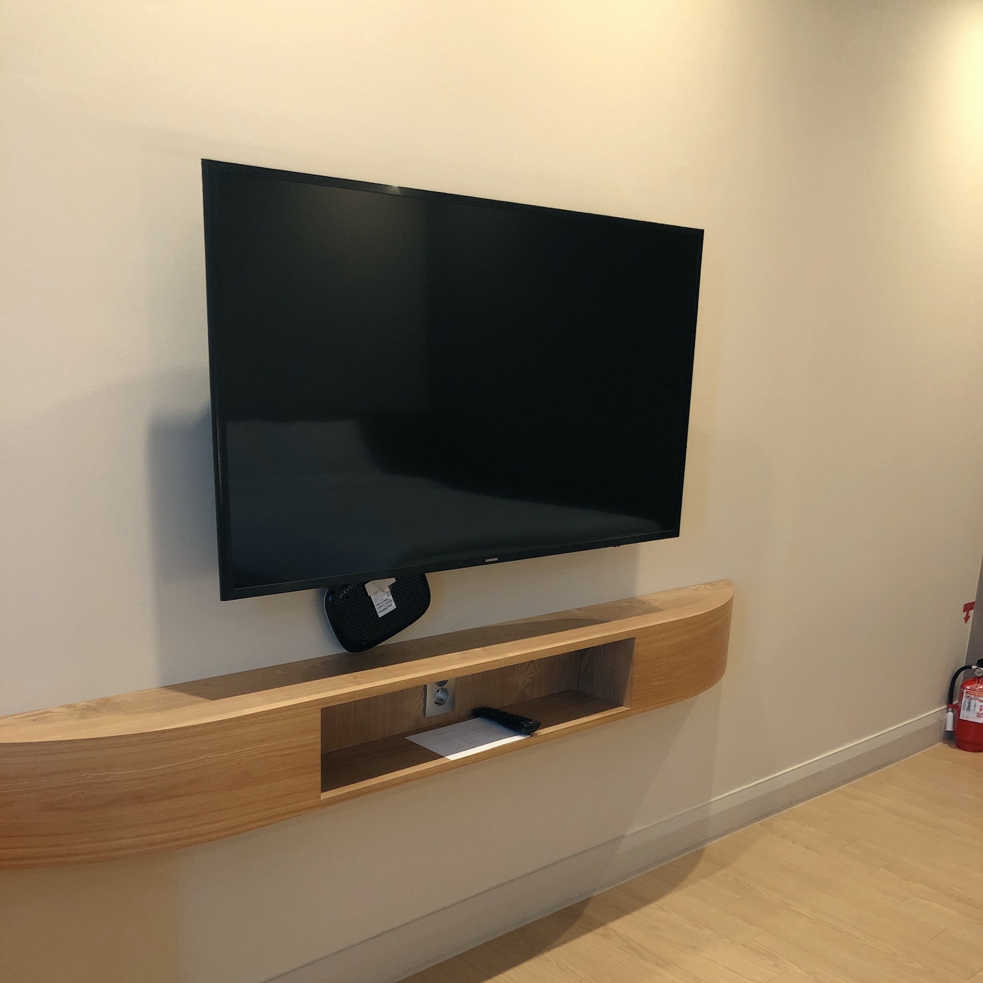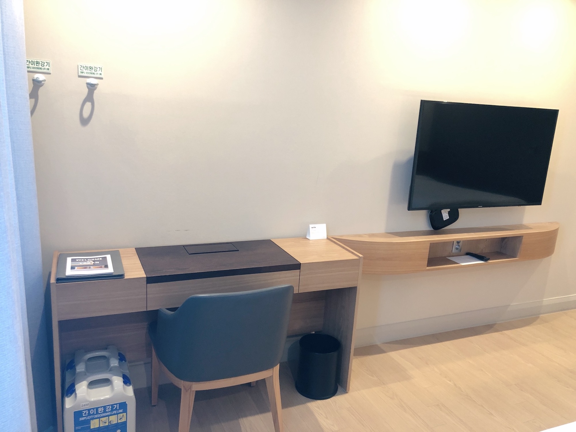 맞은편 벽에는 테이블과 의자가 놓여 있고, 테이블에 있는 덮개를 열면 콘센트가 있어 핸드폰 등을 충전할 수 있다.