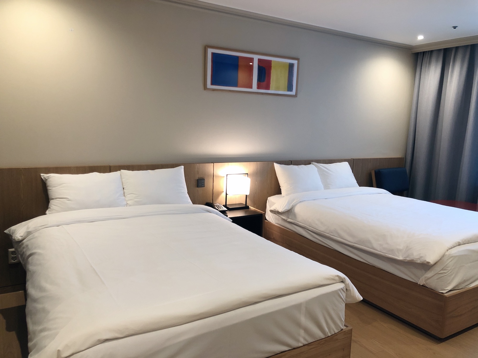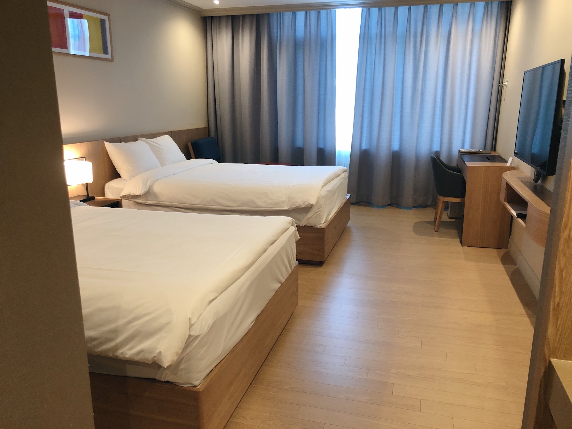 문을 열고 들어가자마자 보이는 객실 풍경이다. 왼쪽으로는 나란히 더블 침대가 2개 놓여 있고, 오른쪽으로는 테이블과 벽걸이 티비가 있다.