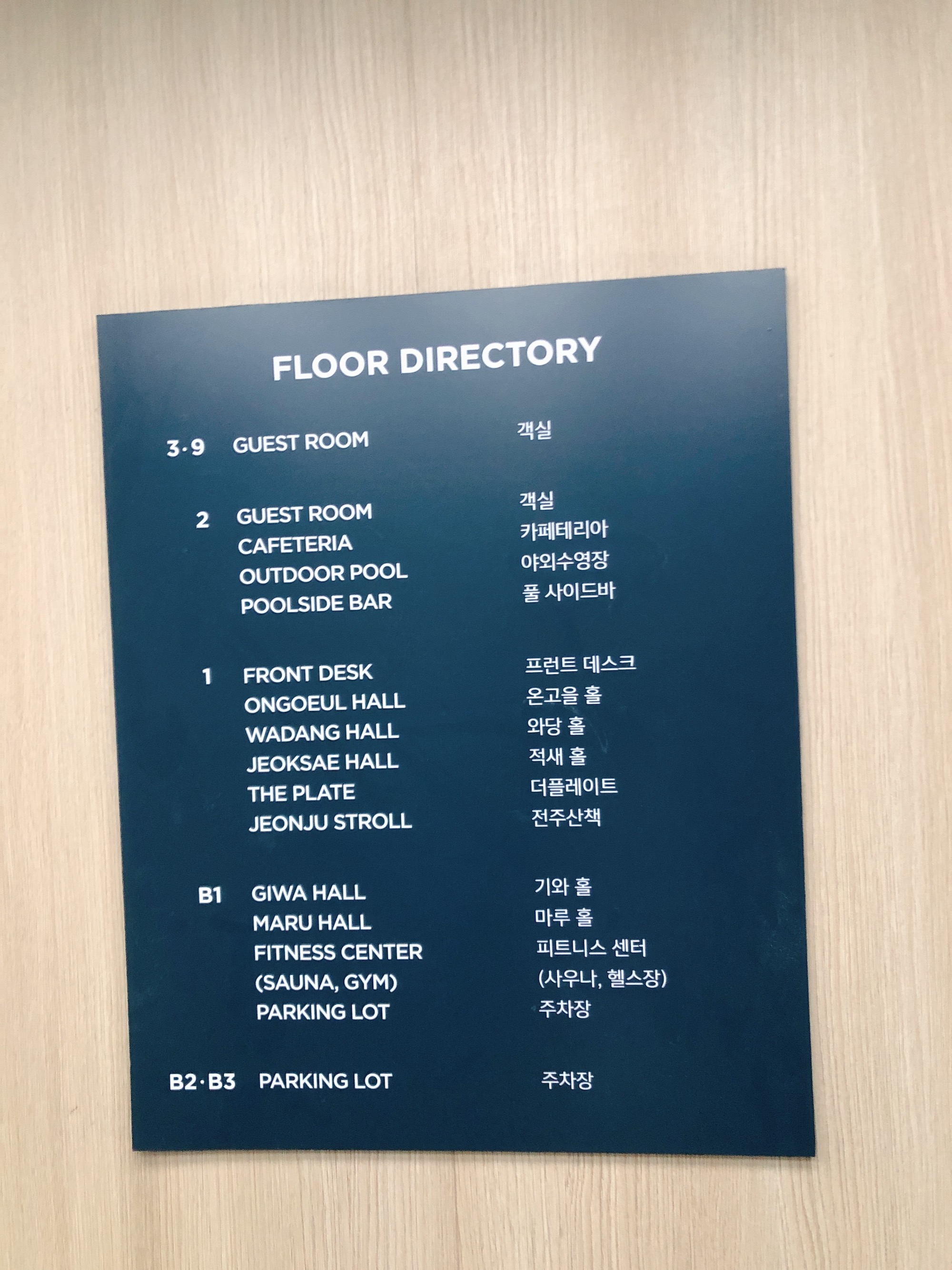 로비가 넓어서 시원한 느낌이 들었다. 1층에는 'the Plate'라는 레스토랑과 '전주산책'이라는 서점&카페가 있다. 우리는 8층 객실을 배정받아서 엘리베이터를 타고 이동했다.