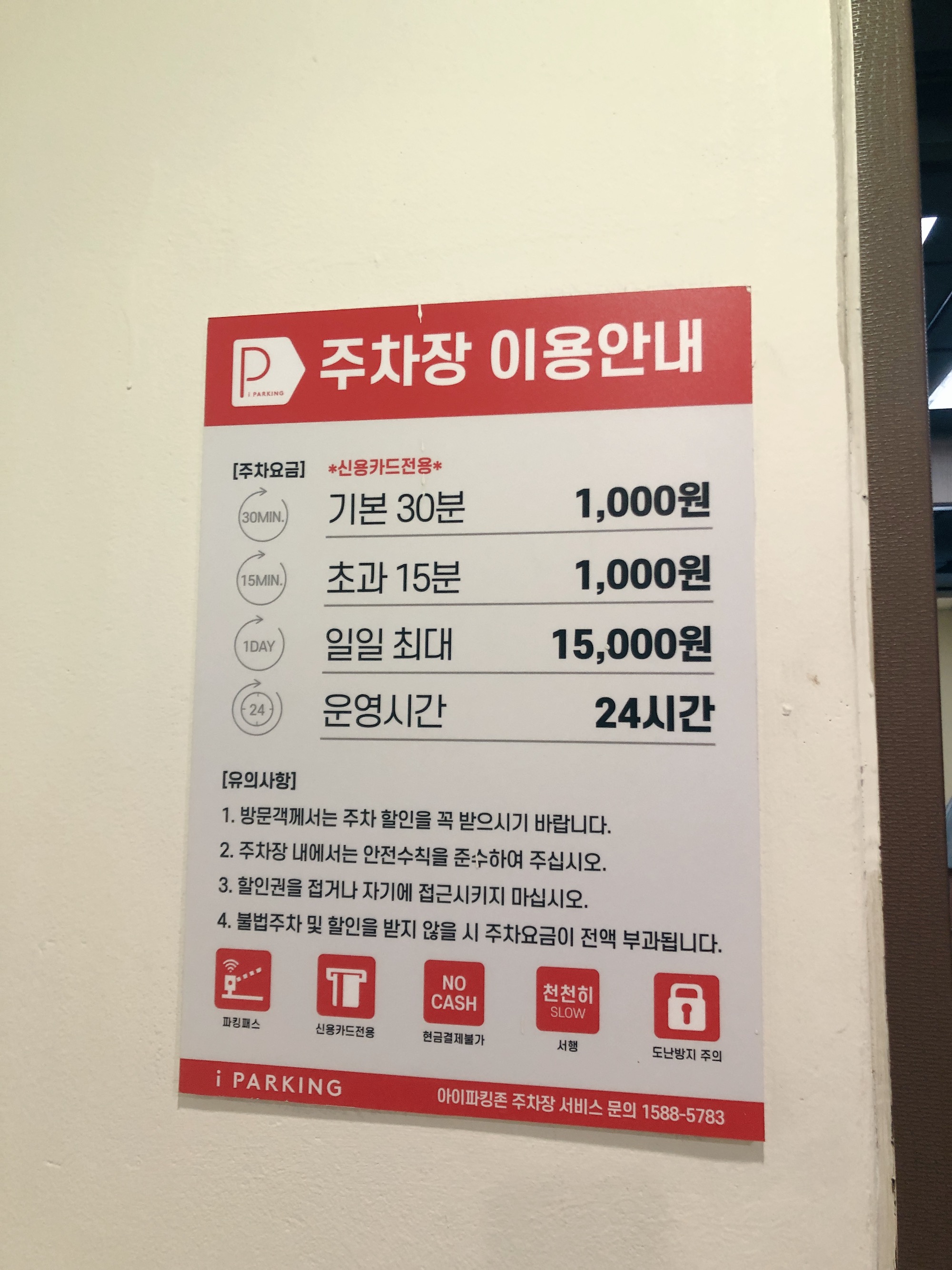 라한호텔 주차장은 넉넉한 편이었는데 투숙객은 다음날 오후 3시까지 무료였다. 투숙객이 아닌 방문객이라면 기본 30분 1,000원 / 초과 15분 1,000원 / 일일 최대 15,000원의 금액으로 주차장 이용이 가능하다.