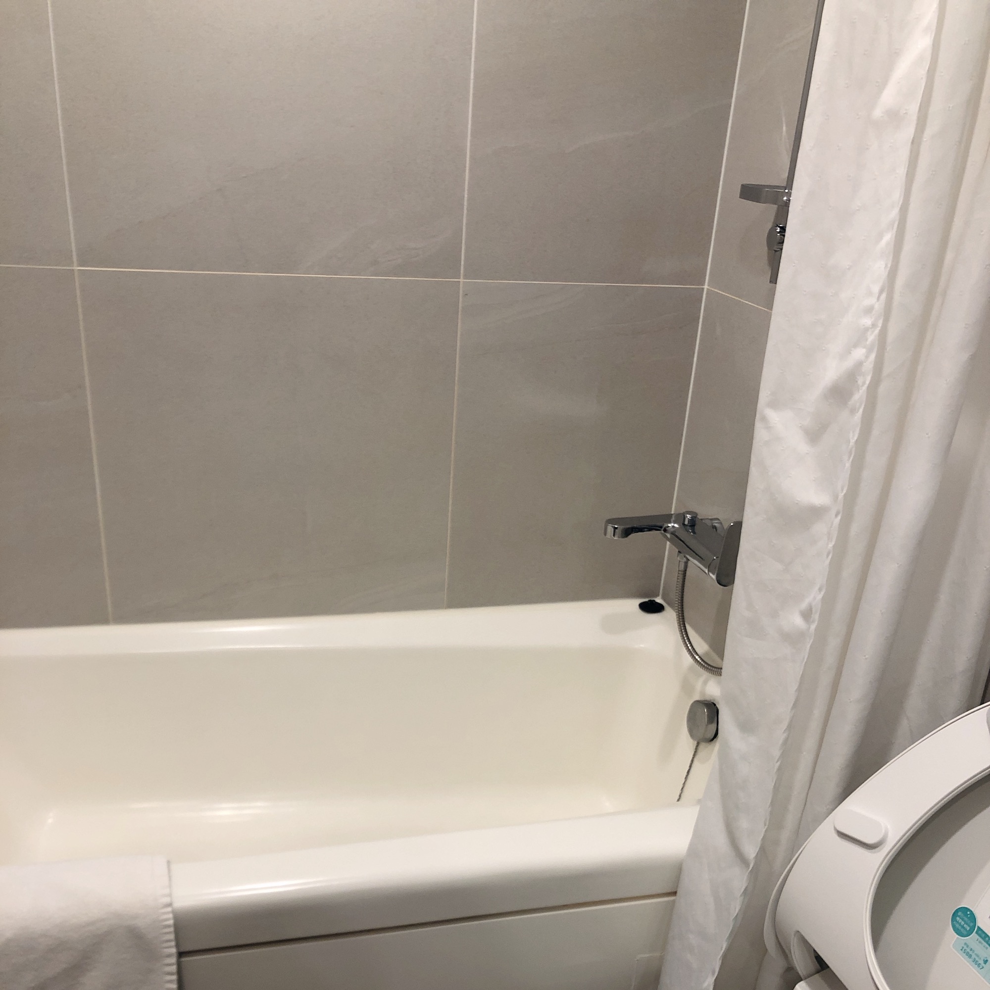 라한 호텔의 화장실은 변기와 욕조가 나란히 있고, 샤워커튼으로 분리할 수 있는 구조였다. 칫솔, 치약을 포함한 어메니티도 모두 갖추어져 있다. 객실 퀄리티가 좋아서 만족스럽게 지낼 수 있었던 전주호텔이었다.
