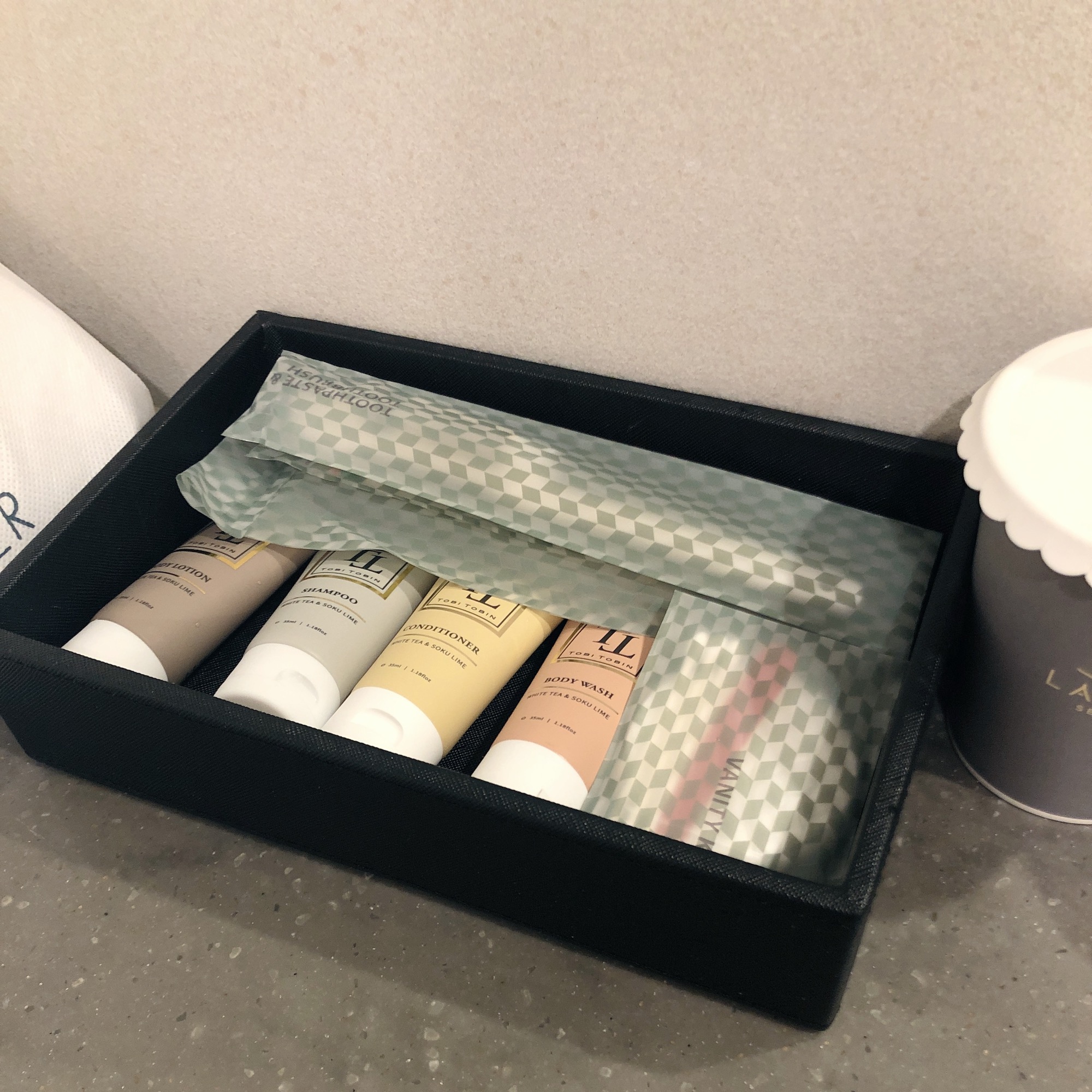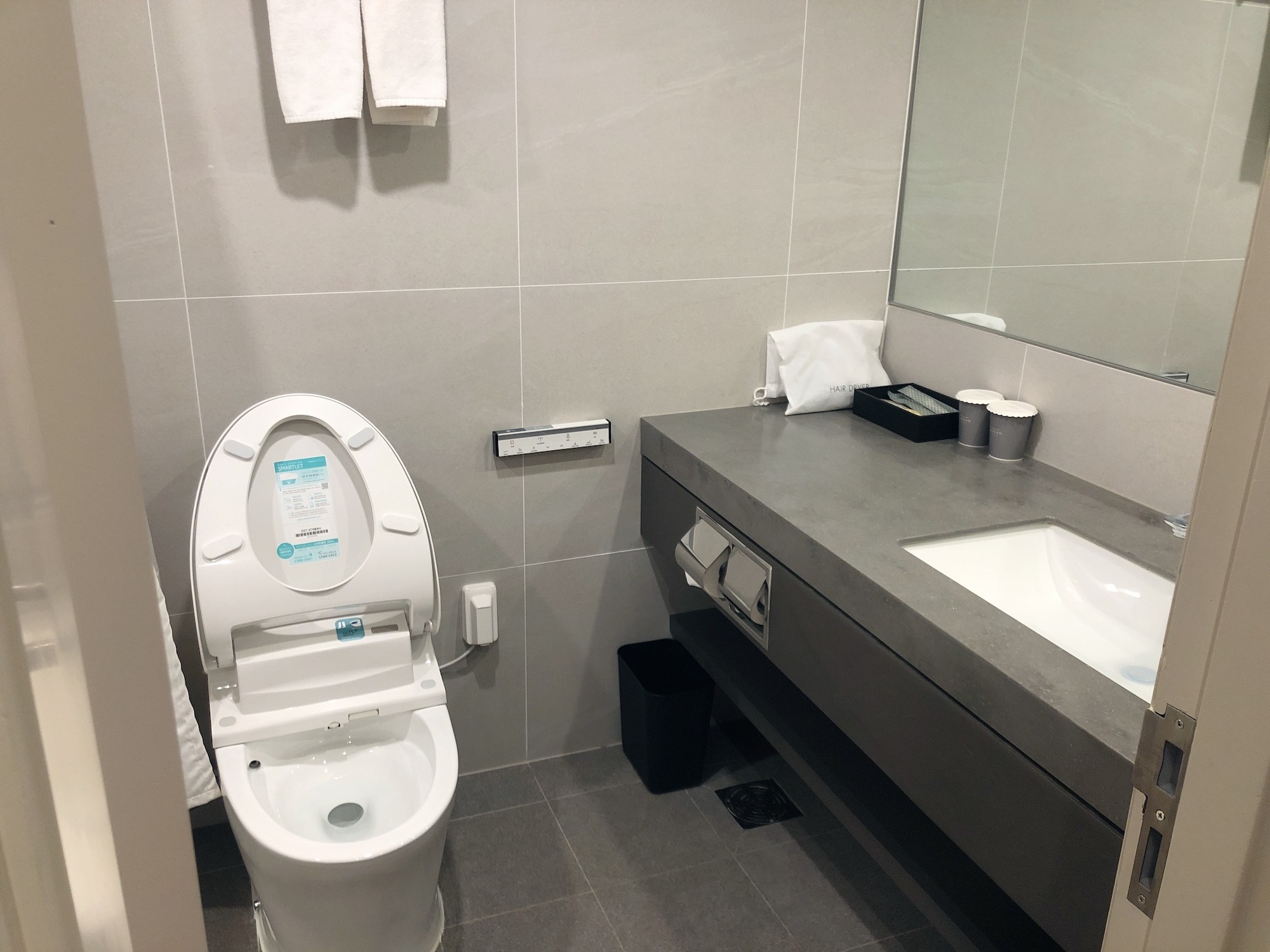 라한 호텔의 화장실은 변기와 욕조가 나란히 있고, 샤워커튼으로 분리할 수 있는 구조였다. 칫솔, 치약을 포함한 어메니티도 모두 갖추어져 있다. 객실 퀄리티가 좋아서 만족스럽게 지낼 수 있었던 전주호텔이었다.