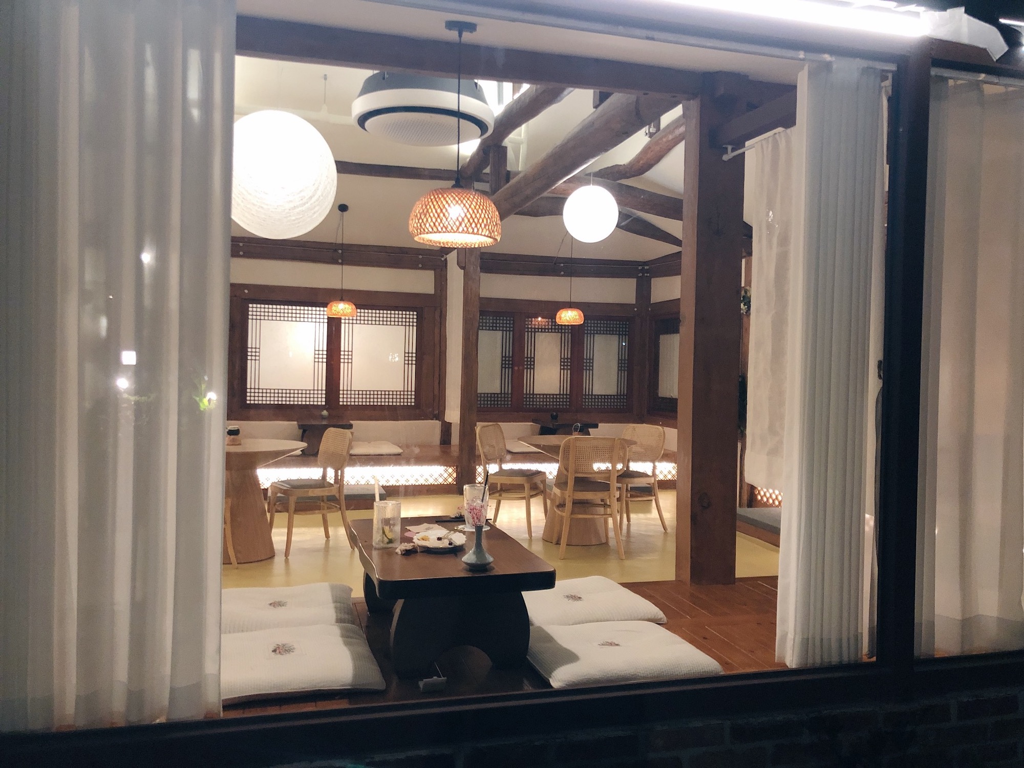 입구 옆의 야외 공간에도 작은 테이블이 하나 놓여있었다. 이 곳도 분위기가 좋았는데 밤이라 날벌레들이 조명에 모여들여서 패스~ 여기저기 구경하고 사진을 찍다가 음료가 나와서, 우리는 적당한 실내 공간에 자리를 잡고 앉았다.