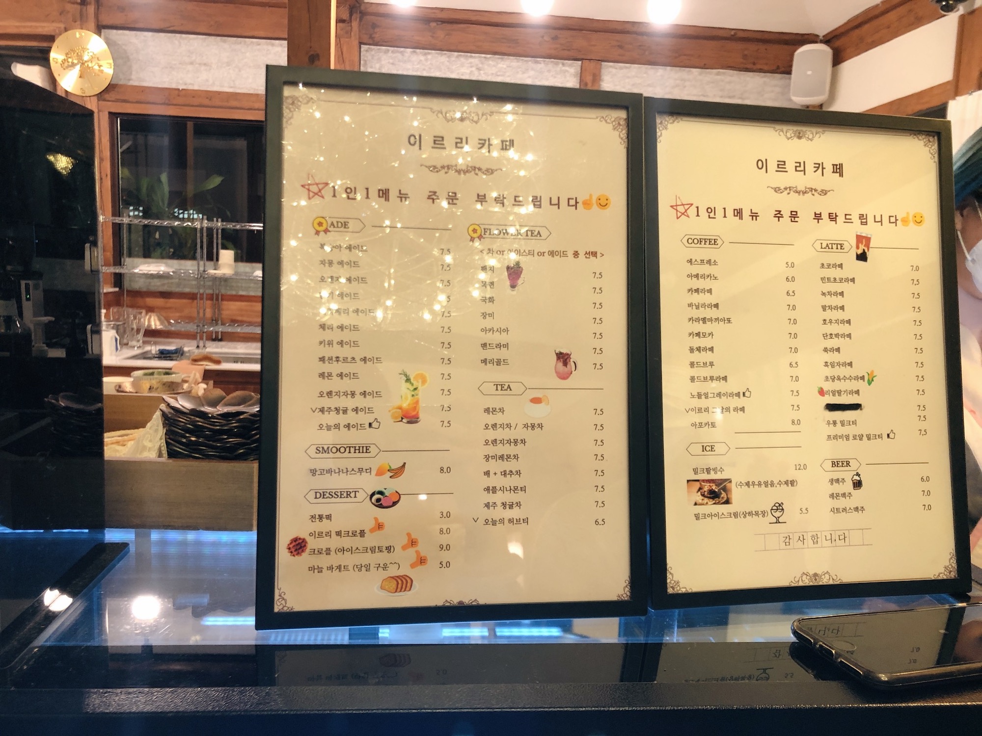 밀크티랑 레몬맥주 맛은 So so... 음료가 엄청 맛있다는 느낌은 아니고 그냥 평범한 수준이었다. 하지만 카페 분위기가 정말 만족스러웠으니 개인적으로는 별 5개 만점에 4.5점을 주고 싶다. 전주 한옥마을 분위기 좋은 좌식카페를 찾고 있다면 '이르리'를 추천한다.