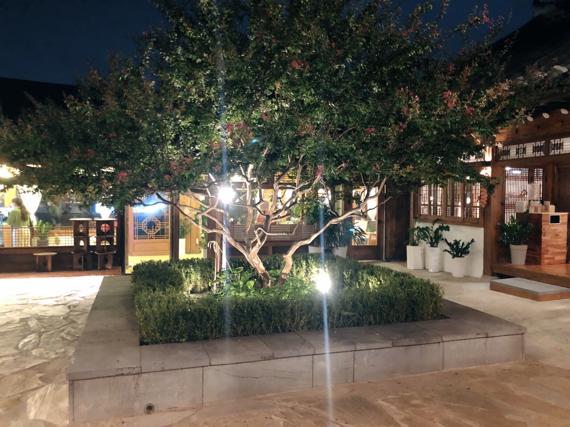 카페 입구로 들어가서 데스크에서 주문을 하고, 반대쪽에 있는 문으로 나가면 넓은 한옥중정을 만날 수 있다. 중정 한가운데에는 커다란 나무가 심어져 있었다. 중정을 둘러싼 4면의 실내공간에는 모두 음료를 마실 수 있도록 테이블이 놓여 있었는데 입식, 좌식 - 취향에 맞게 골라서 앉을 수 있다. (테이블 진짜 많음! 짱 넓음!) 중정 뒤쪽으로는 복층 구조의 정자? 오두막?도 하나 있었고 사람들이 삼삼오오 모여 앉아서 담소를 나누고 있었다.