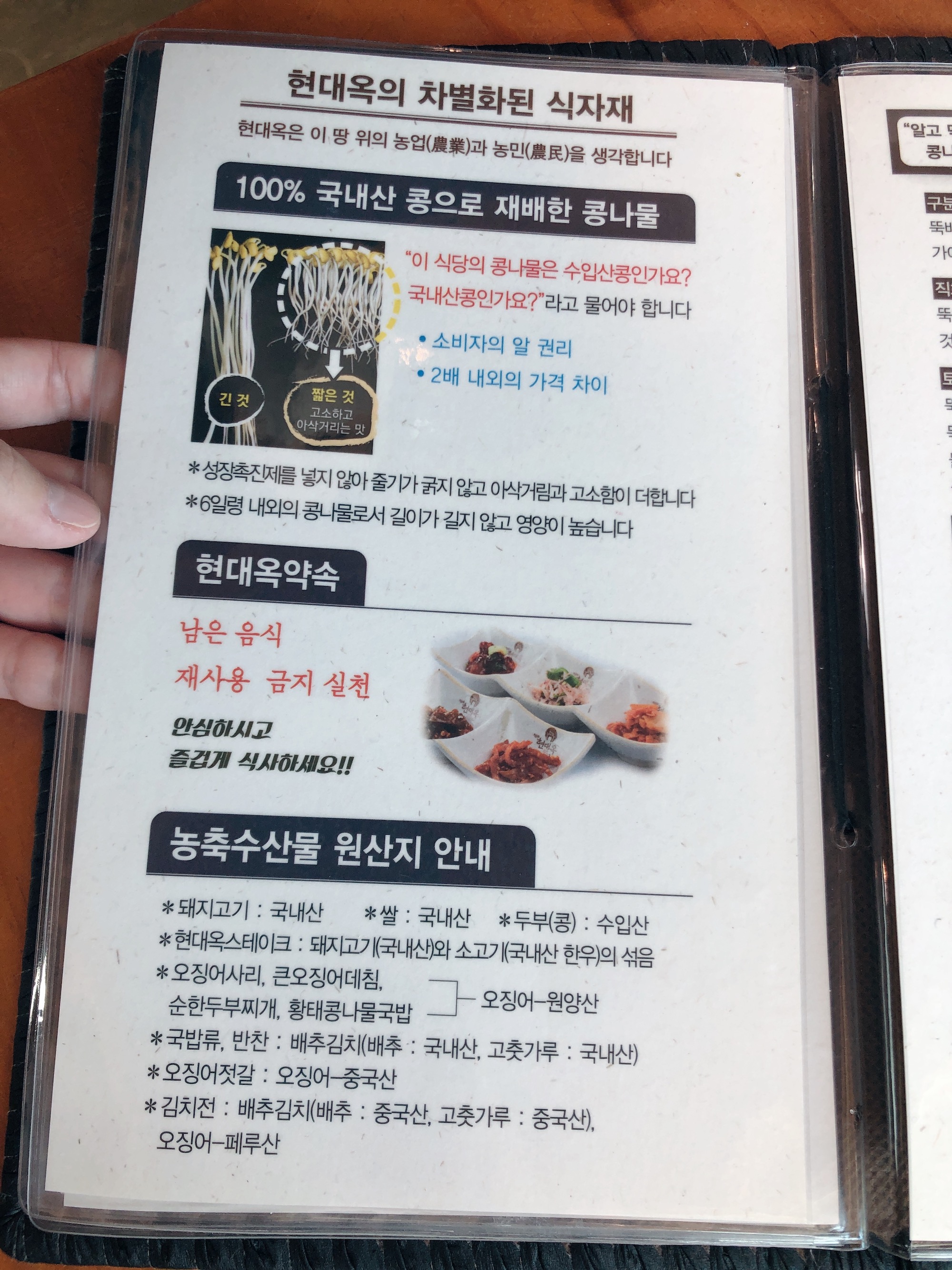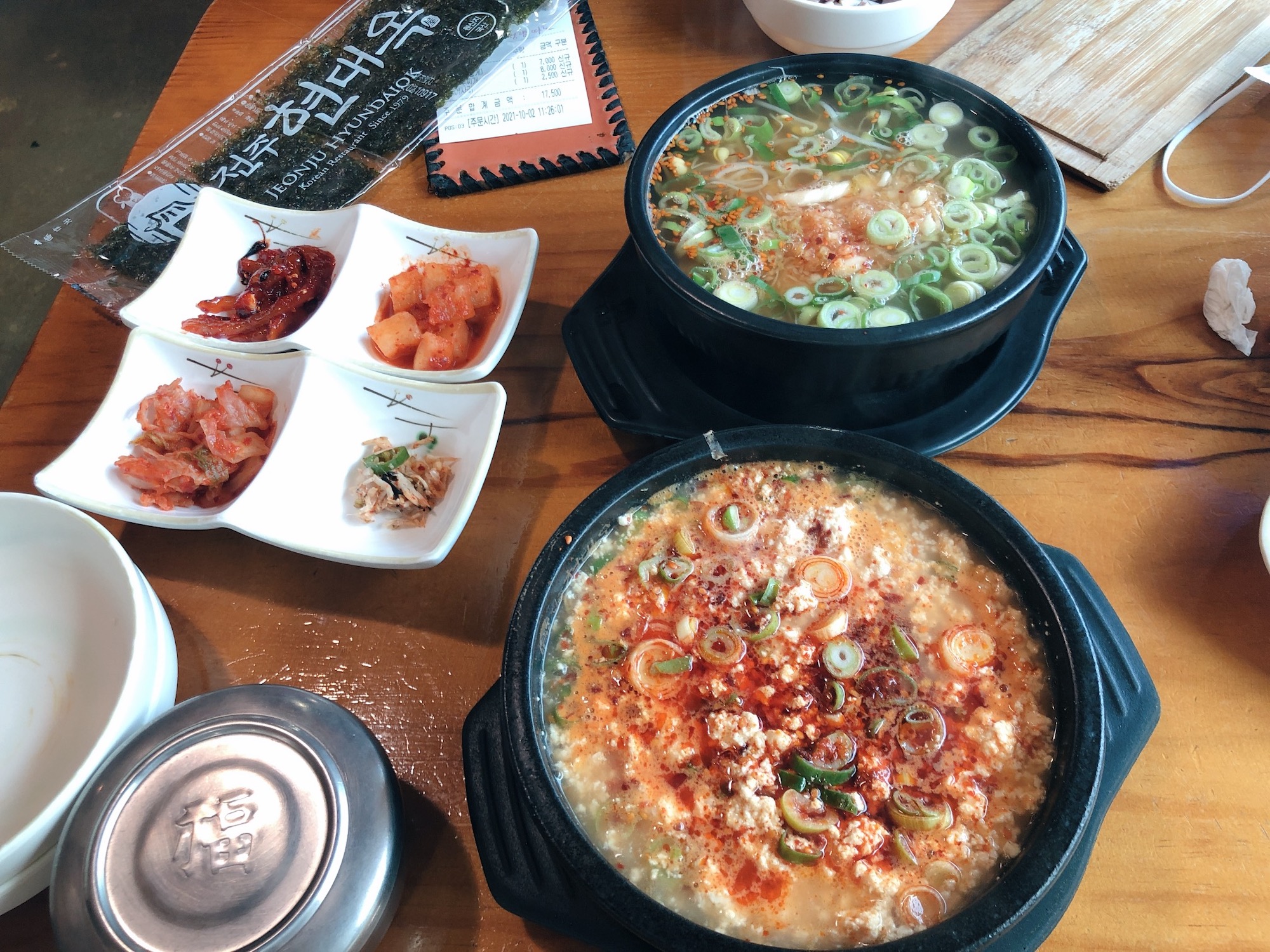우리는 전주남부시장식콩나물국밥과 현대옥순한순두부찌개를 하나씩 주문하고, 오징어사리도 추가했다. 메뉴판에 수란을 맛있게 먹는 방법도 소개되어 있었다.