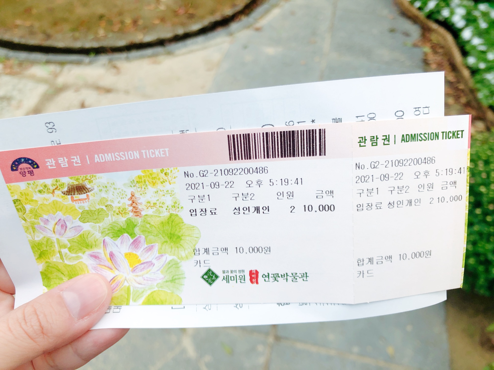 우리는 성인 두 명 관람권을 구입했다. 폐장하기 40분 전쯤에 관람권을 구입하여 시간이 많지 않았다. 때문에 세미원 전체를 다 돌아보는 것은 어렵다고 판단하여 세계수련관, 유상곡수, 사랑의 연못 등 바깥쪽에 위치한 곳들은 건너 뛰고 빅토리아 연못, 열대수련정원, 백련지 등 비교적 가운데 있는 곳들을 실속있게 돌아보기로 계획했다.