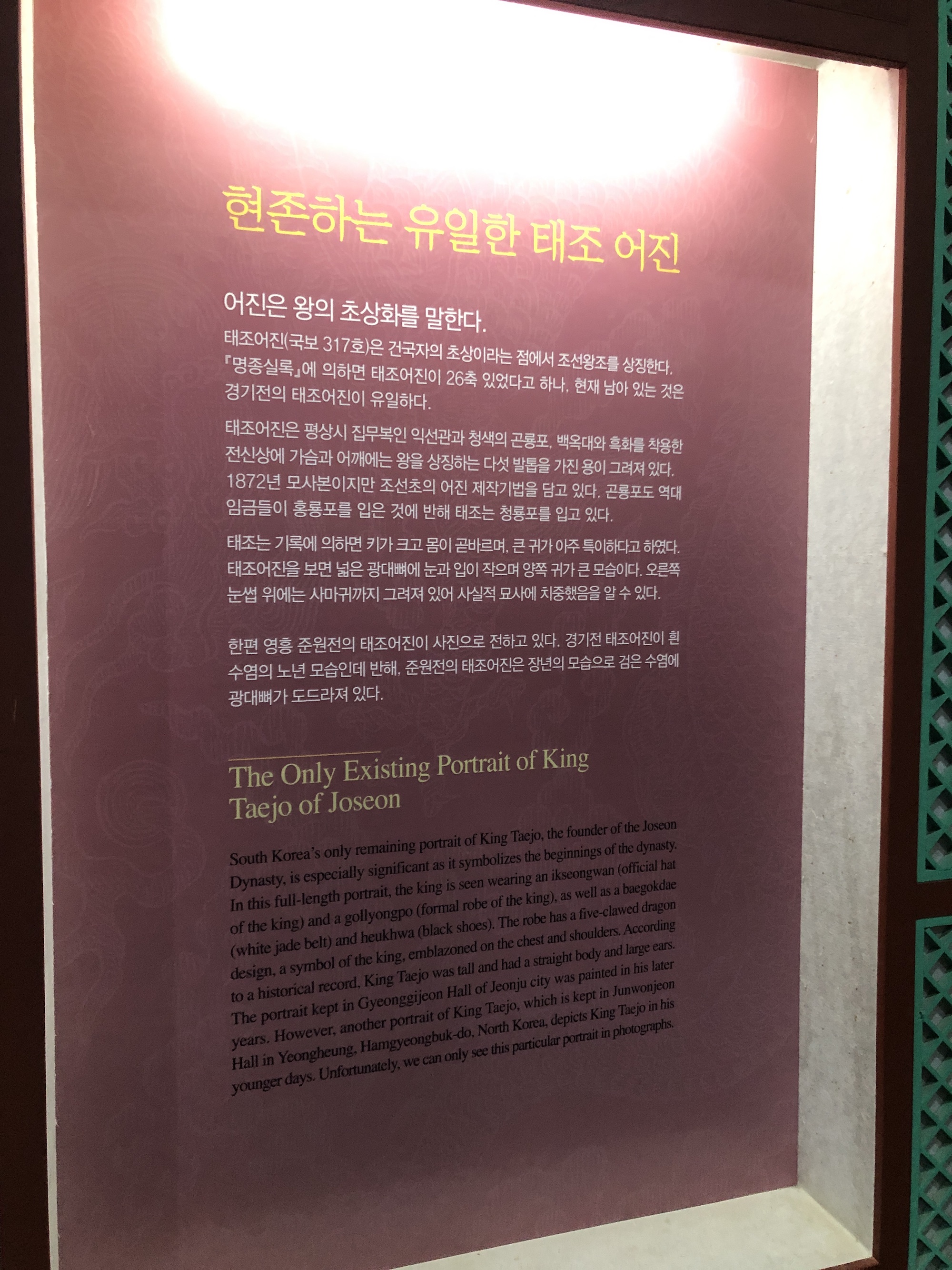어진에 대해 짧게 설명하자면... 어진은 왕의 초상화를 말한다. 태조어진(국보 317호)은 건국자의 초상이라는 점에서 조선왕조를 상징한다. 명종실록에 의하면 태조어진이 26축 있었다고 하나, 현재 남아있는 것은 경기전의 태조어진이 유일하다. 박물관을 둘러보며 어진에 대한 기초 지식을 습득할 수 있어서 흥미로운 시간이었다.