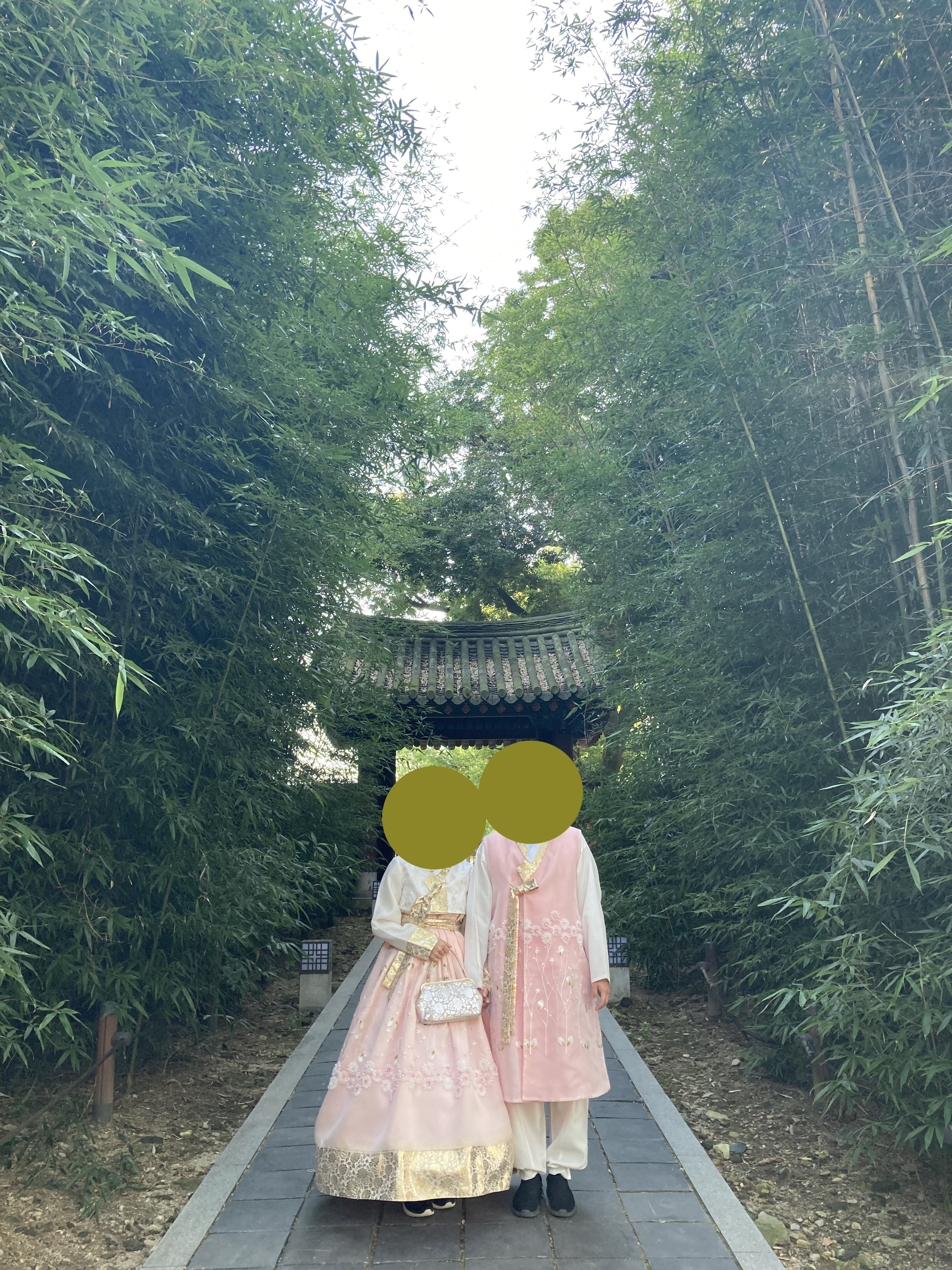카페 하녹당에서 시간을 보내며 해가 조금 기울어지길 기다린 우리는 다시 전주 한옥마을 투어를 시작해보기로 했다. 가장 먼저 한 일은 한복 대여였다. 한옥마을 입구 쪽에 있는 '입다'라는 한복대여소에서 밝은 연분홍색 한복을 선택했다. 대여비는 1시간 대여 시에 15,000원 / 종일 대여 시에 20,000원이었다. 차이가 5,000원밖에 나지 않는다는 것은 그냥 하루종일 빌리라는 거...ㅋㅋㅋ 사장님께서 머리도 예쁘게 올려주셨는데 마음에 쏙 들었다. 평소에 무채색의 어두운 색상 옷을 즐겨입는 그에게 밝은 색상의 한복이 괜찮을까 걱정했는데, 나보다도 훨씬 더 예쁘게 어울려서 놀랐다. 사실은 꽃돌이가 체질이었던게야!