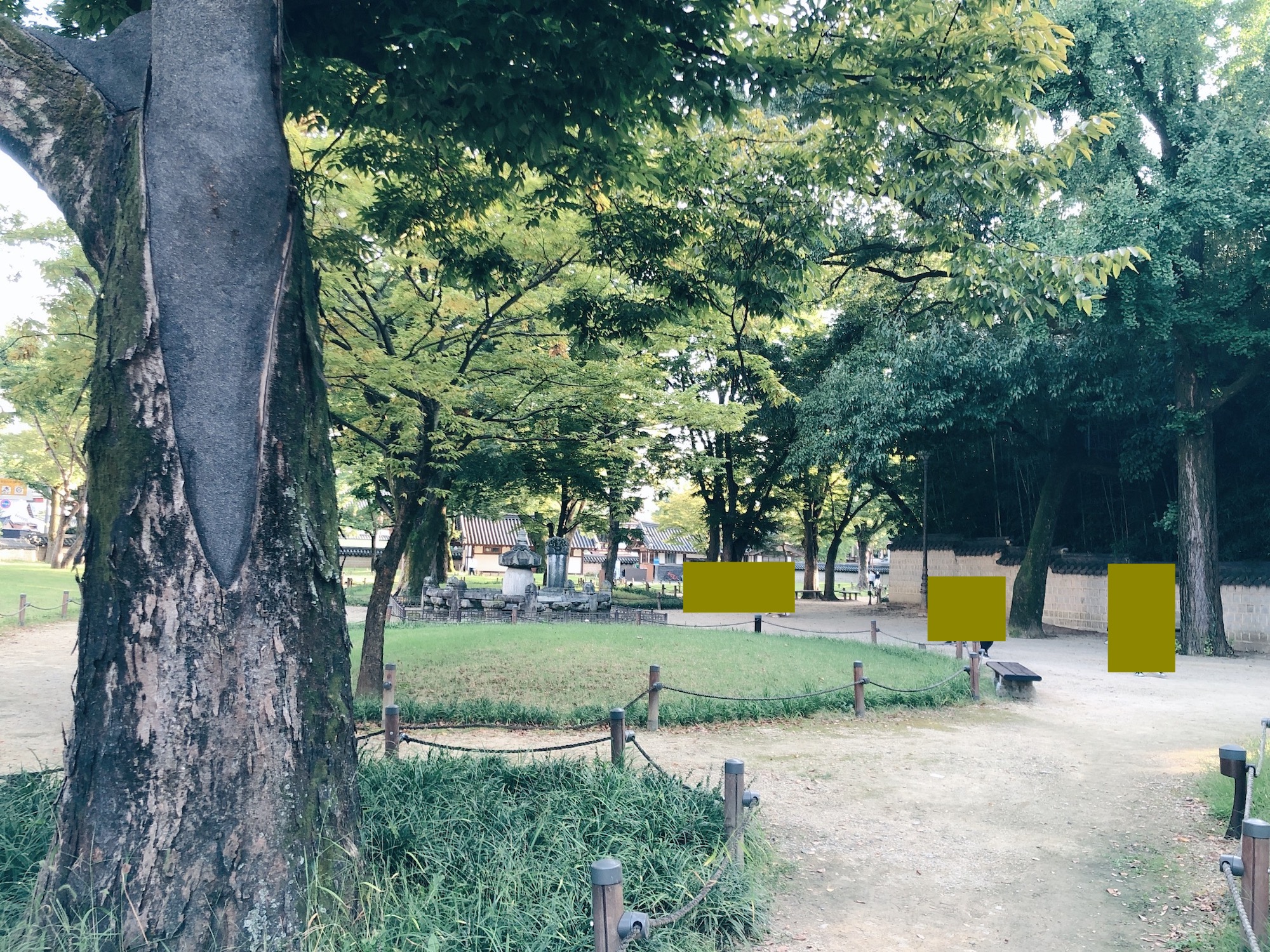 경기전은 첫인상은 넓은 공원 같다는 생각이 들었다. 관람객들이 꽤 많았는데 공간이 워낙 넓어서 크게 붐비는 느낌은 들지 않았다. 여기저기에 사진 찍기 좋은 근사한 풍경들이 있었다. 그래서 사람들이 줄을 서서 차례대로 사진을 찍었다. 평소에 사진을 즐겨 찍지 않는 우리도 한복을 입은 기념으로 천만년만에 줄을 서서 사진을 찍어 보았다.
