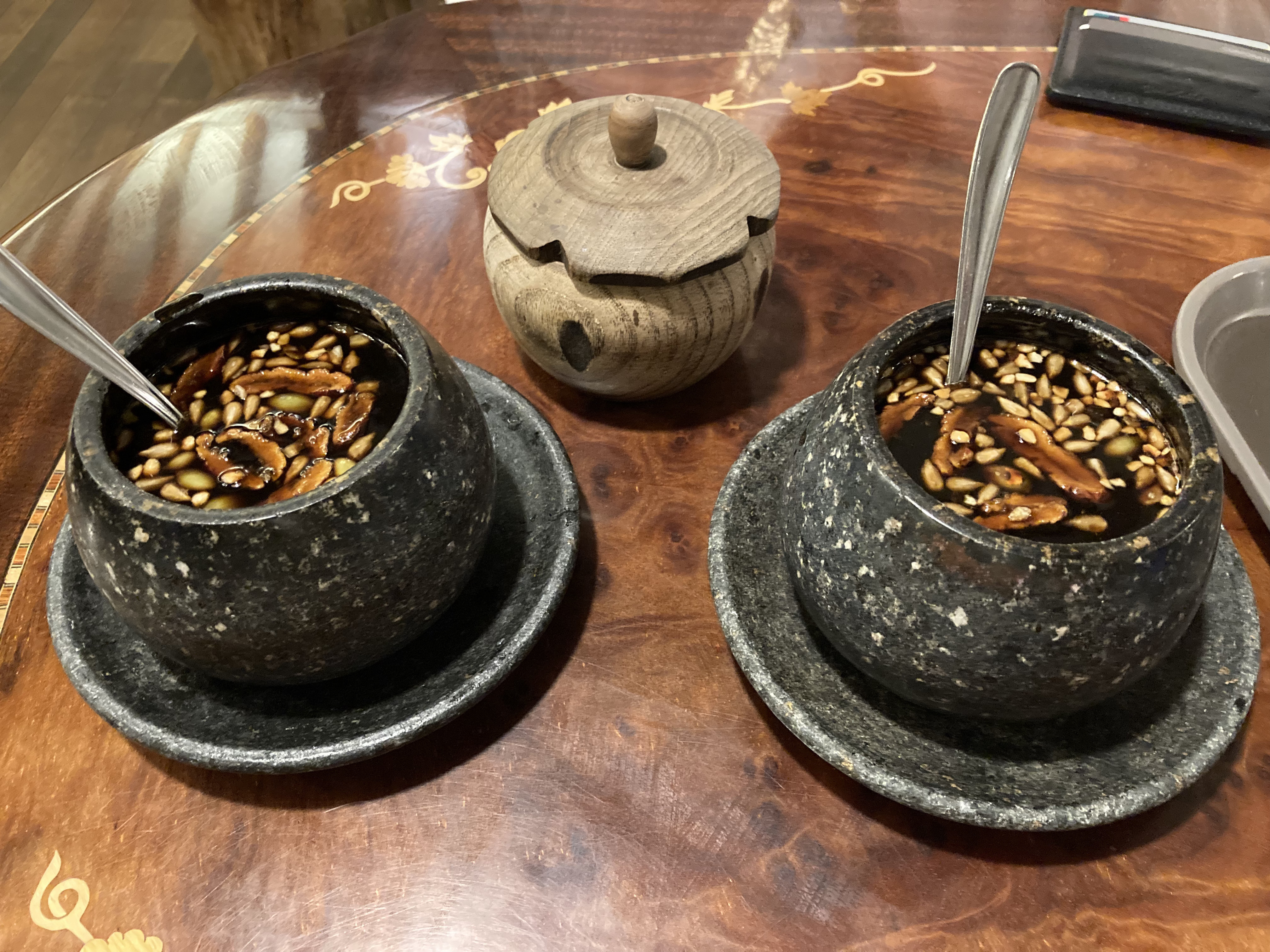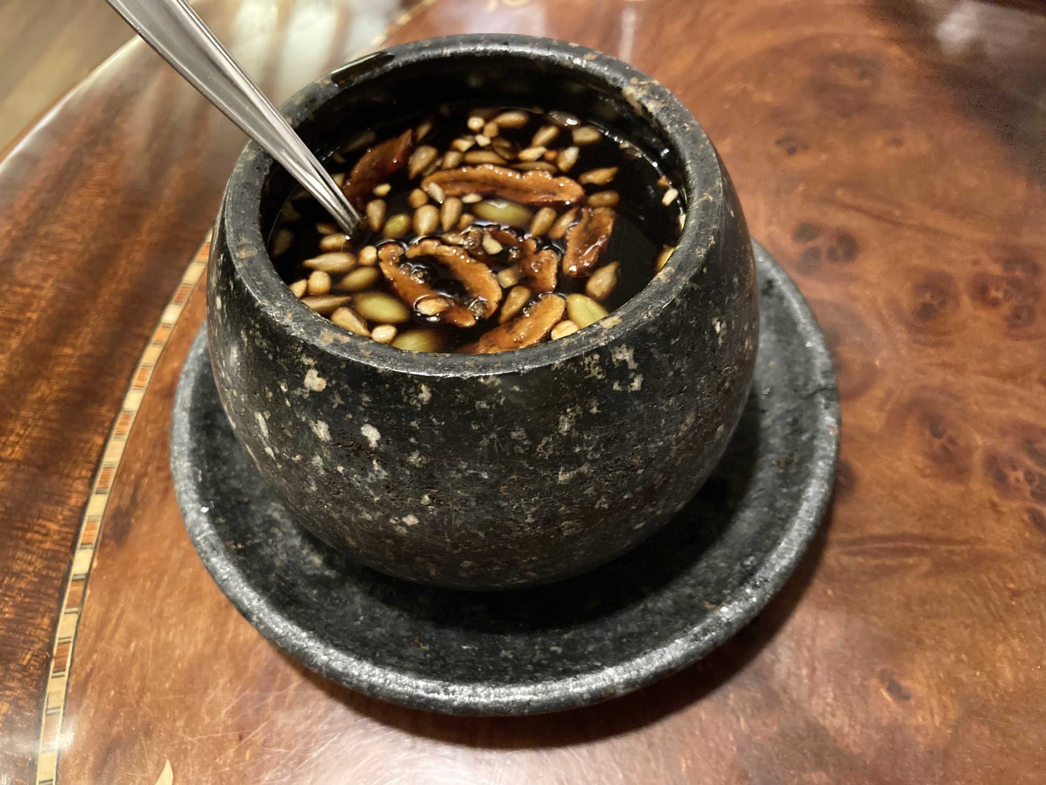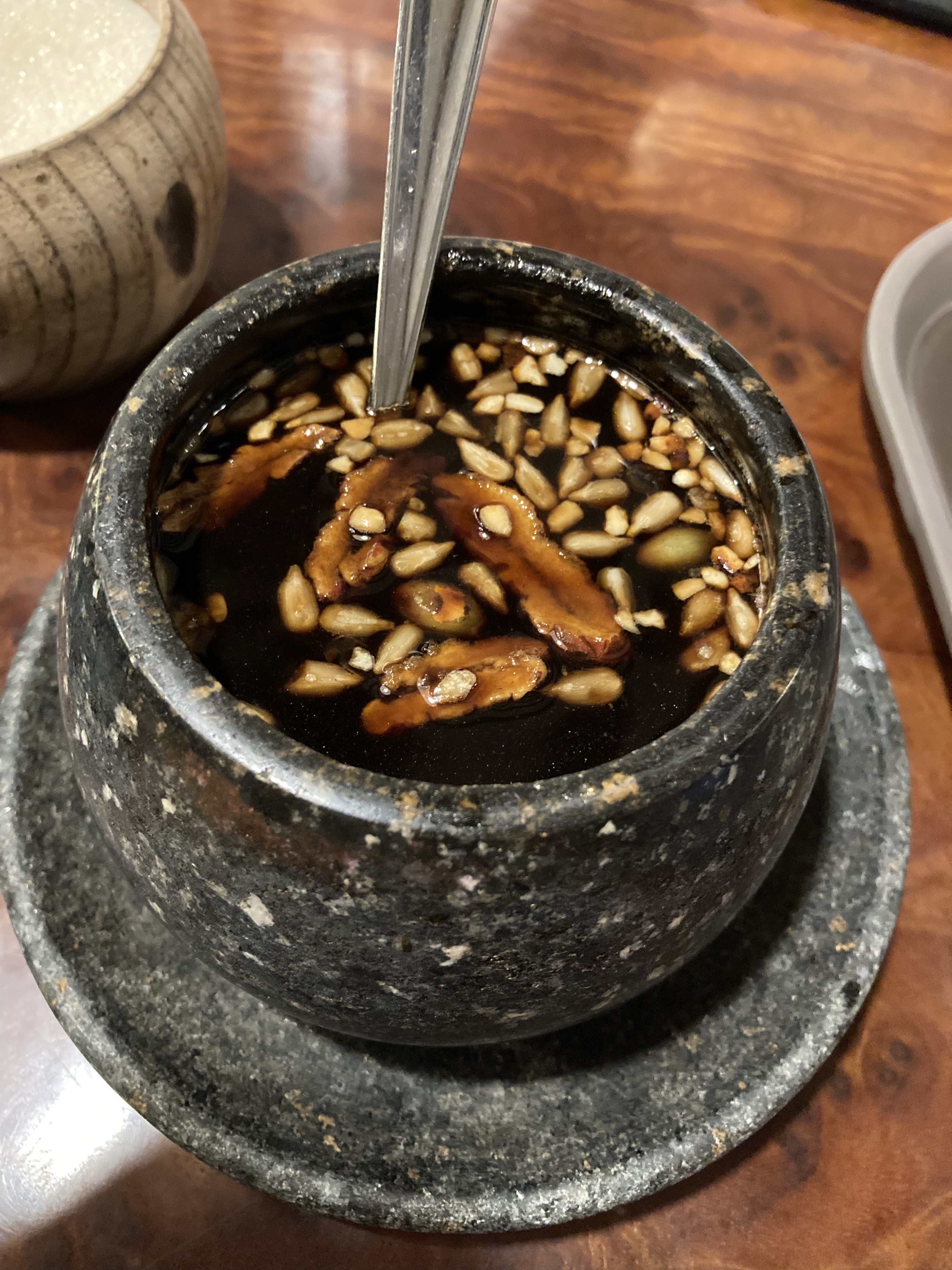 특선쌍화탕과 십전대보탕은 얼핏 보기에는 큰 차이가 없어 보였다. 그리고 함께 주는 설탕을 넣어 취향에 맞게 마시면 된다. 그런데 윽, 내가 생각하는 그 쌍화탕 맛이 아니었다. 이것은 그냥 몸에 엄청 좋아 보이는 한약(보약)맛이었다. 이렇게 쓴데 몸에 좋지 않을리가 없어. 실제로 대추, 잣 등 견과류도 알차게 들어있다. 하지만 설탕을 넣지 않고 그냥 먹으면 피를 토하며 죽을 것만 같은걸...?-_-; 설탕을 많이 넣고 어느정도 달달하게 만들어서 마시기는 다 마셨는데, 다시 선택하라고 하면 아이스 오미자차를 주문할 거다.