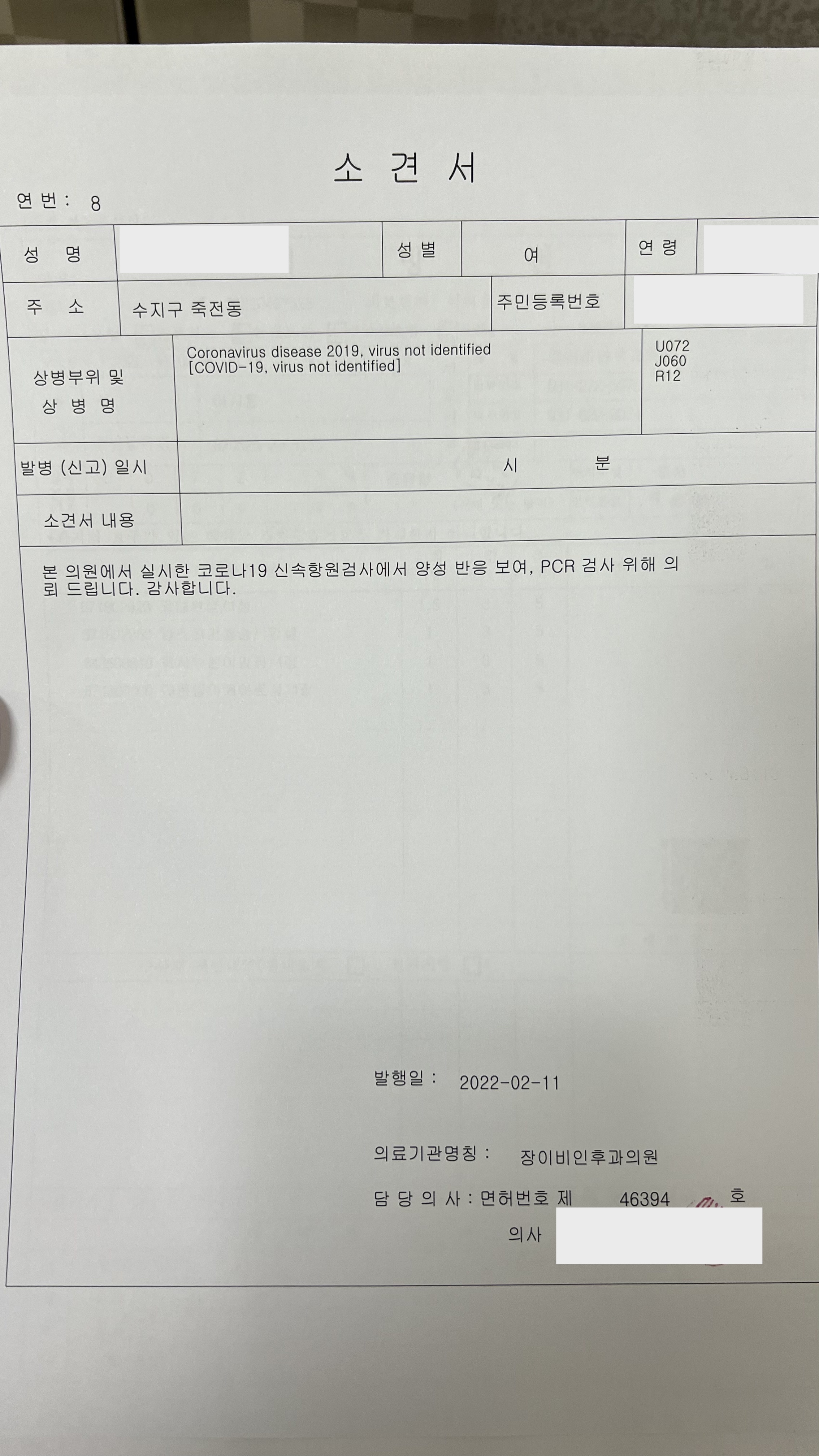 다음 날 아침, 부랴부랴 외출 준비를 하고 동네 병원에 갔다. 의심 증상이 있고 pcr 검사를 통해 정확한 감염 여부를 알고 싶어도, 만약 자가검사에서 음성이 나오면 pcr 검사를 받을 수 없다고 한다. 불행인지 다행인지 나도 검사 결과가 '양성'이었다. 병원에서 써 준 소견서를 가지고 곧바로 선별진료소로 갔다. 대기 없이 바로 pcr 검사를 받을 수 있었다.