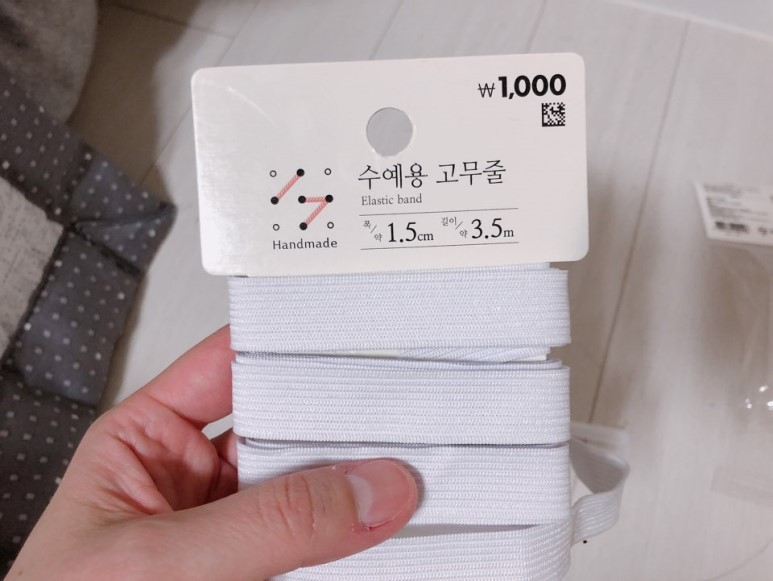 준비물은 다이소에서 파는 천원짜리 수예용 고무줄과 실, 바늘, 가위만 있으면 된다. 다이소에서 파는 수예용 고무줄은 두께가 다양한데 일단은 제일 두꺼운 1.5cm로 가져왔다.