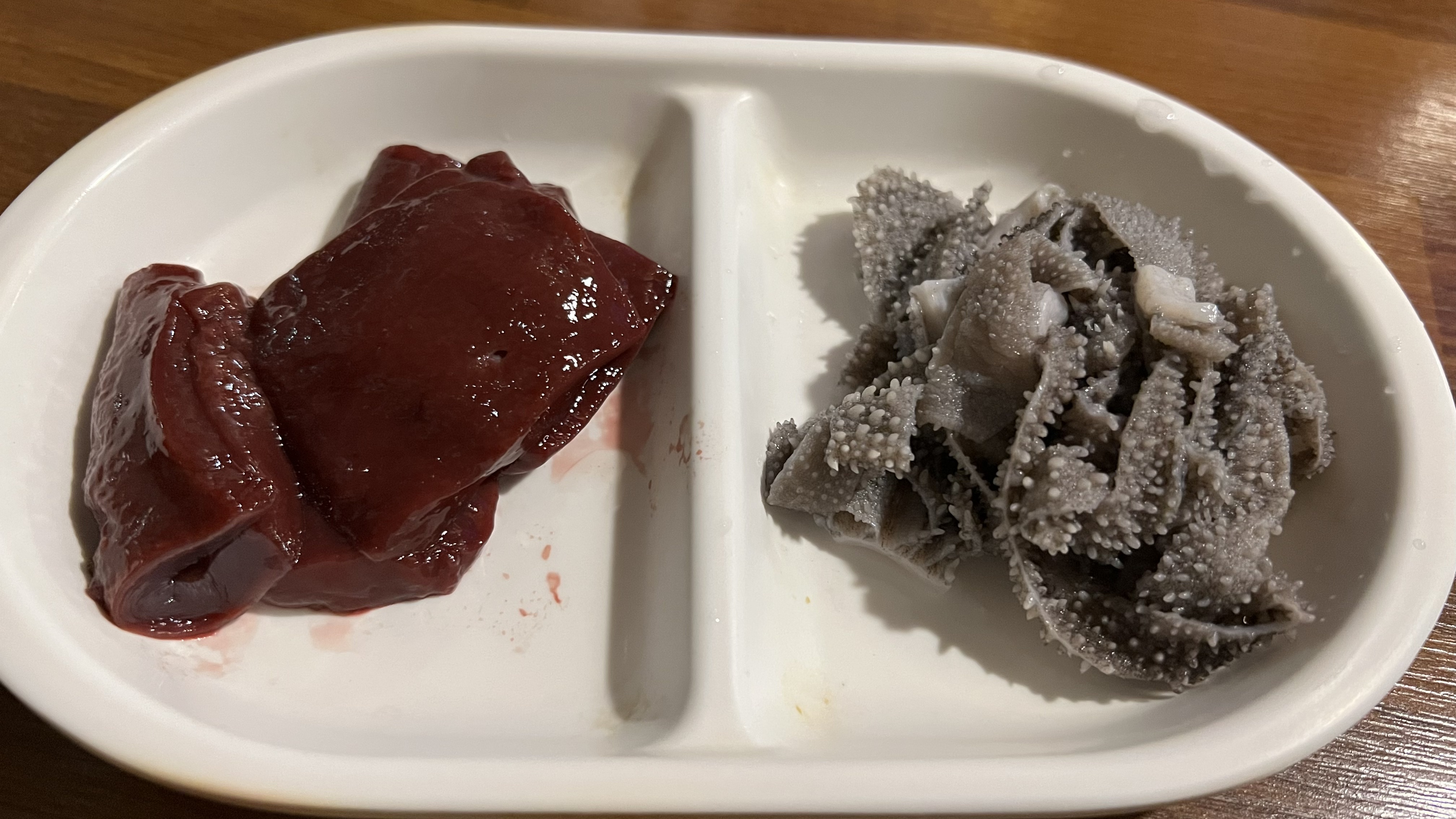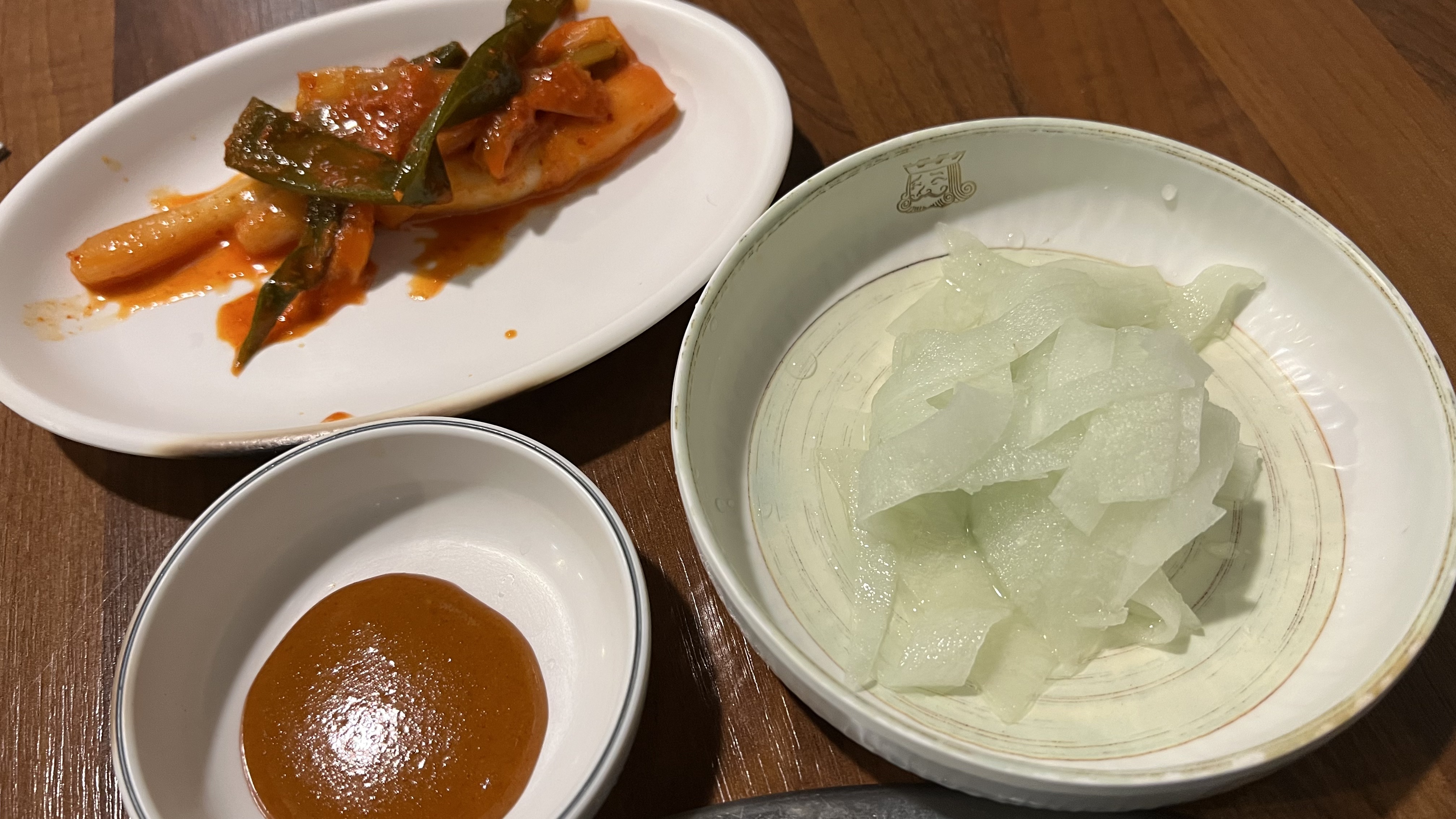 메인 메뉴가 나오기 전에 신선한 생간, 천엽, 콩나물 라면, 대파김치, 쌈무, 각종 소스 등이 먼저 나온다.