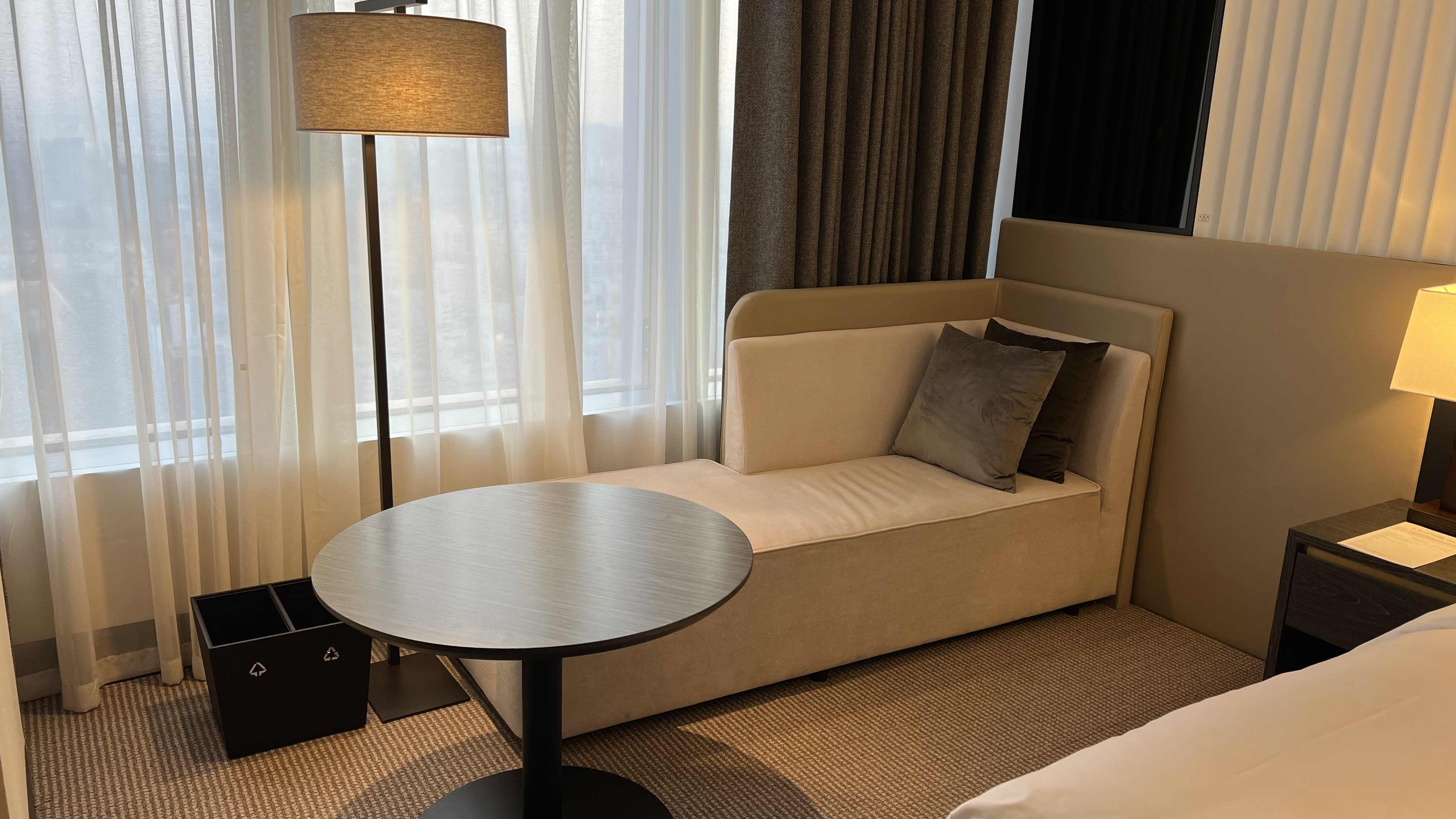 침대 옆 창가쪽으로는 푹신해 보이는 소파와 동그란 테이블, 장스탠드, 휴지통이 있다. 37층이라 뷰를 기대했던 우리는 가장 먼저 커텐을 열어 보았다.