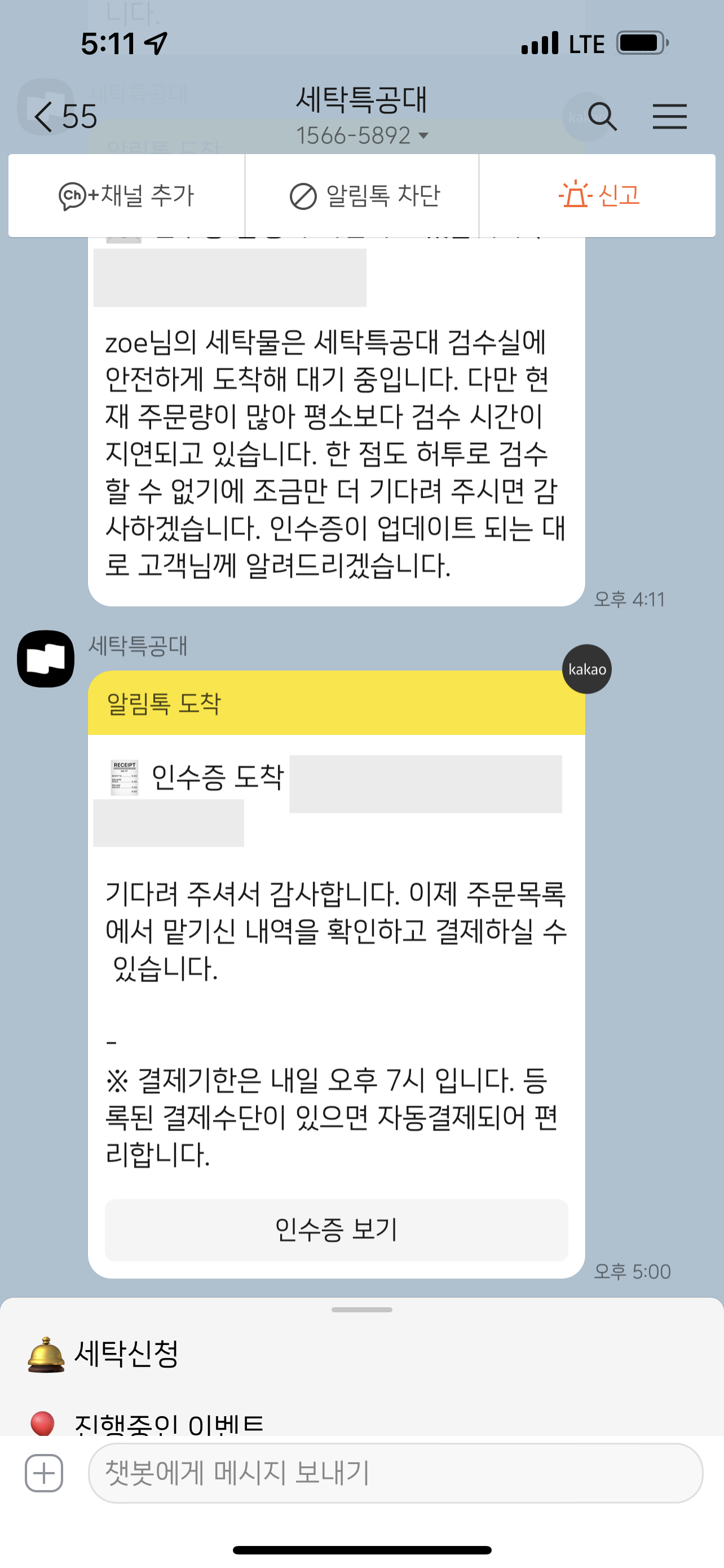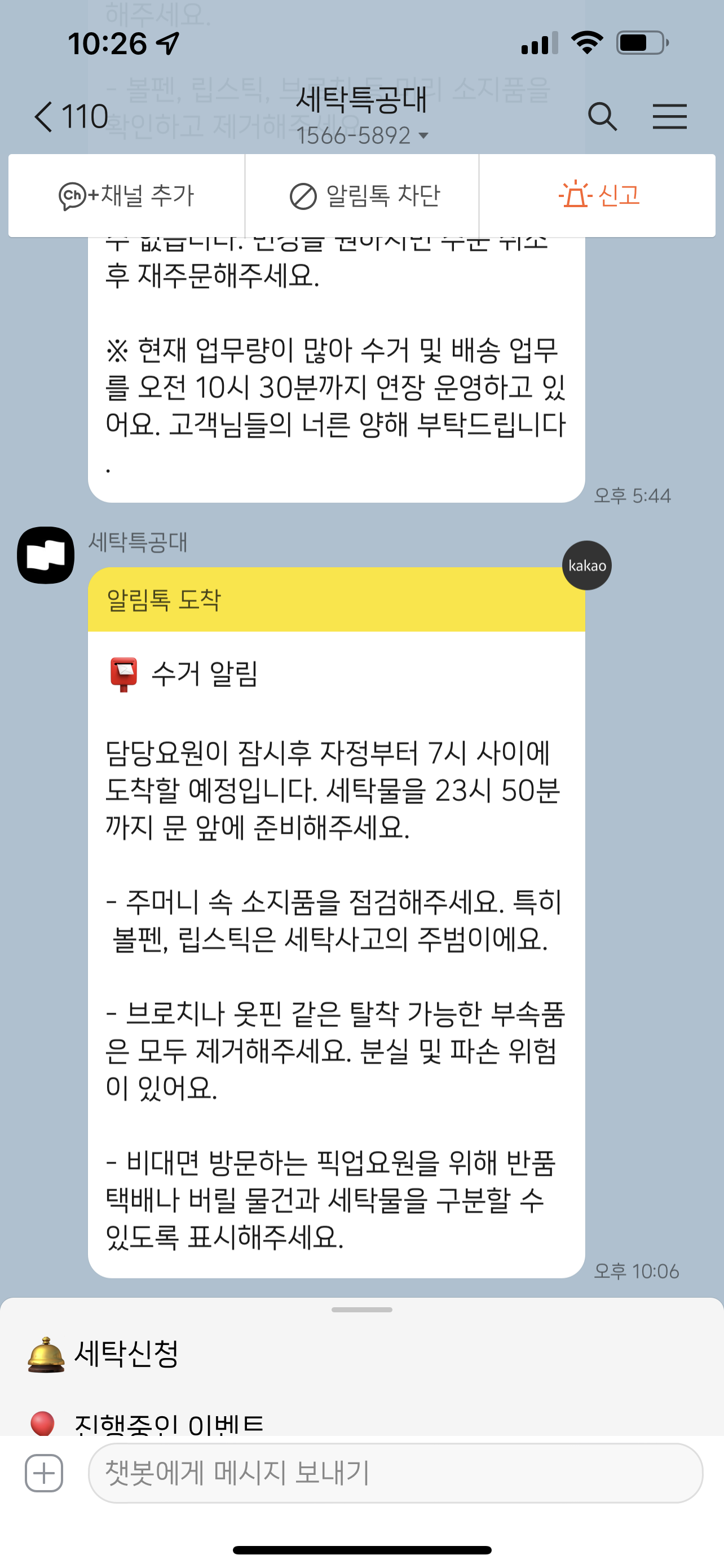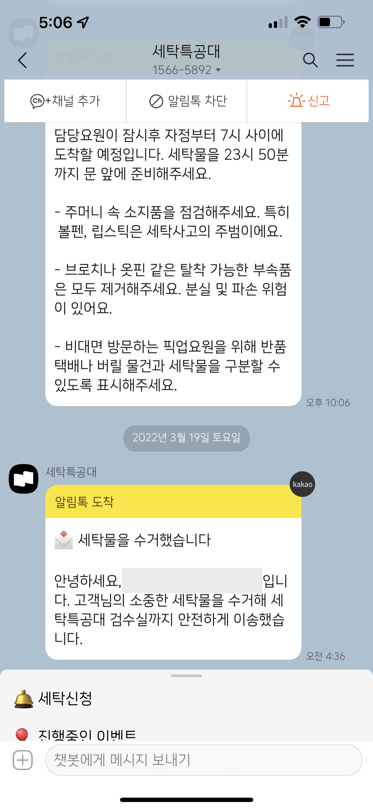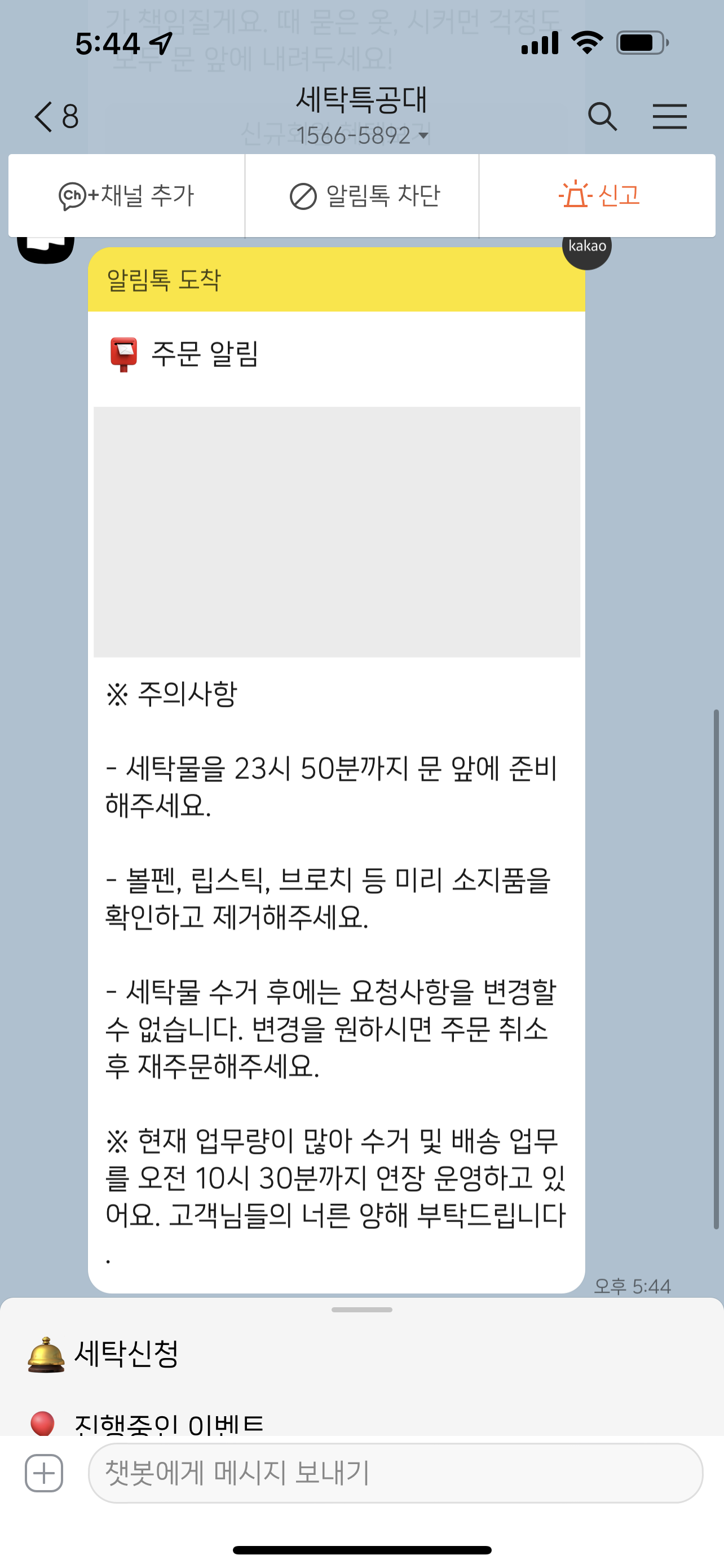 주문을 하고 나면 카카오플친 메세지를 통해서 신청 상황을 확인할 수 있다. 세탁물을 내보내기 전에 볼펜, 립스틱, 브로치 등 주머니에 소지품이 들어있지는 않은지 체크하는 것이 좋으며, 수거 후에는 요청사항을 변경할 수 없어서 만약 변경을 원한다면 주문 취소 후에 다시 주문해야 한다. 담당요원이 자정부터 7시 사이에 세탁물을 수거할 예정이라는 메세지와 함께, 다음 날 오전 4:36에 검수실까지 안전하게 이송했다는 카톡 메세지를 받을 수 있었다.
