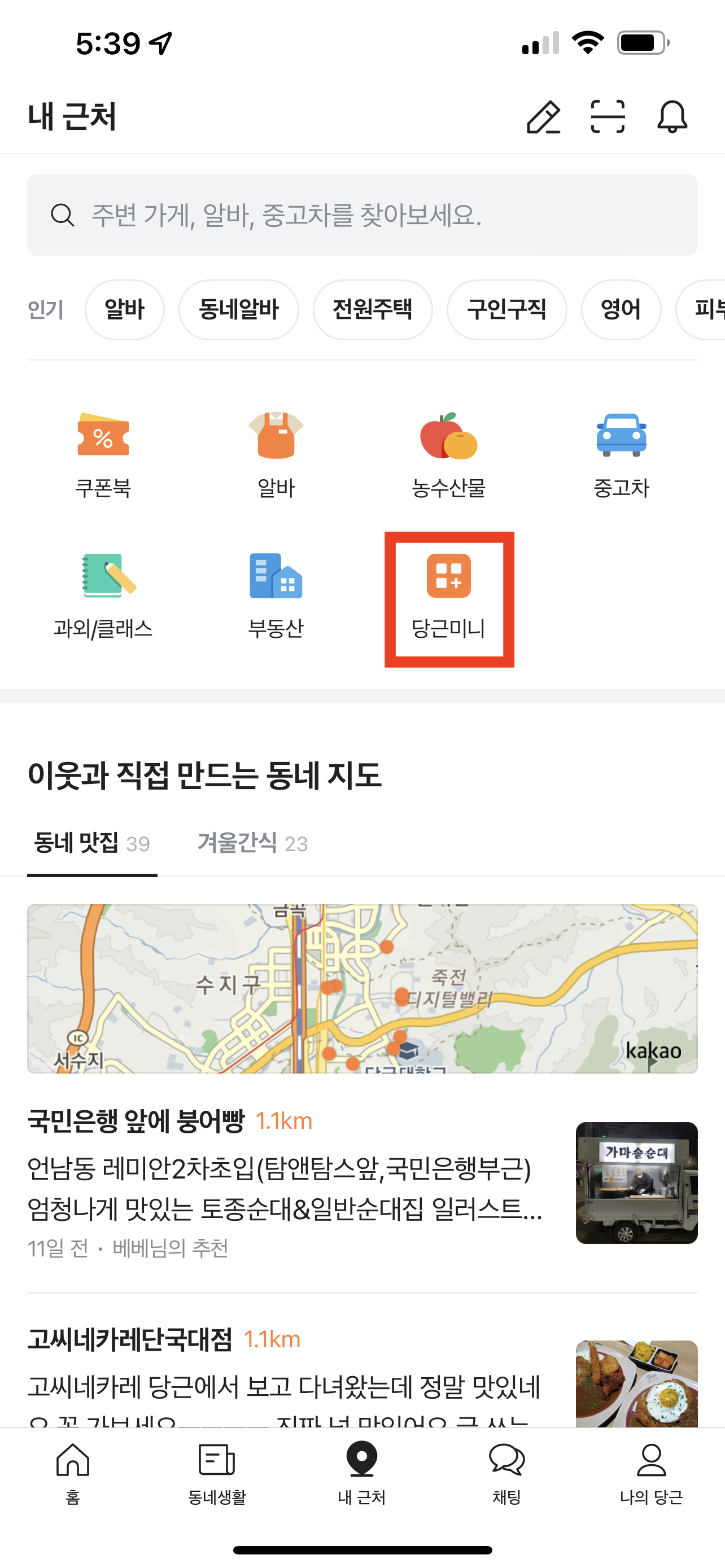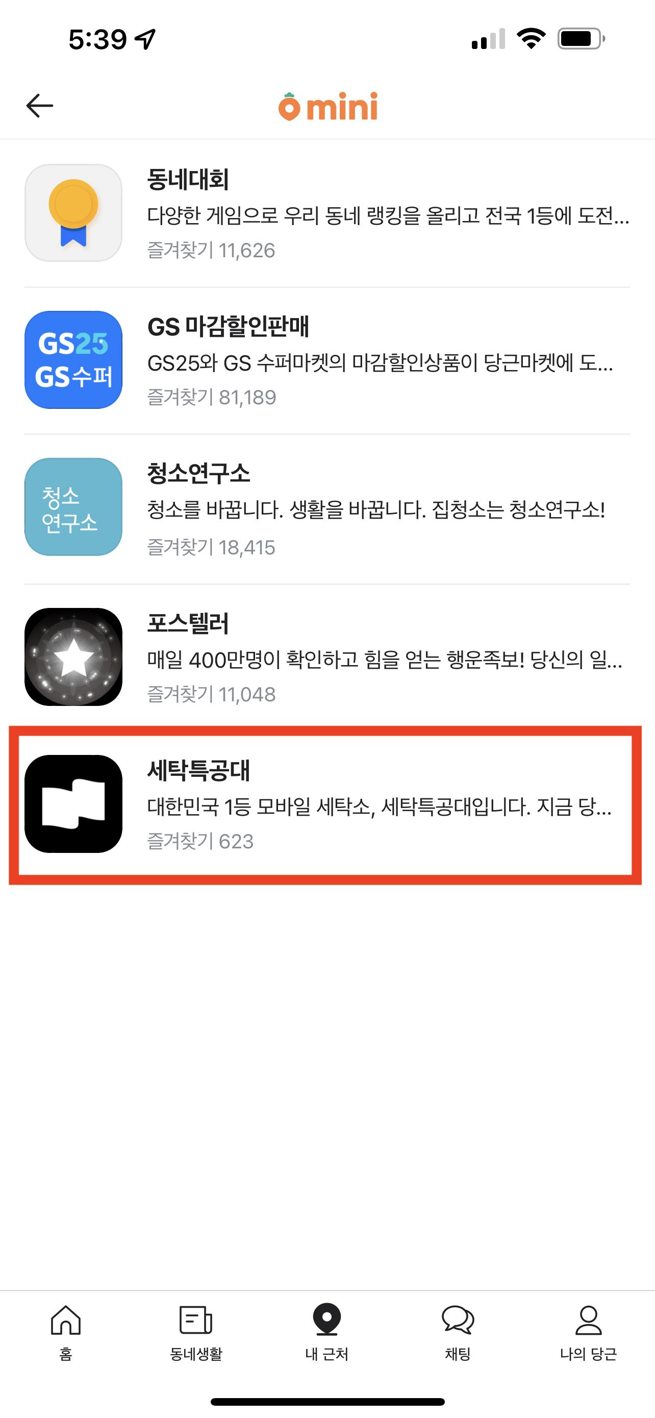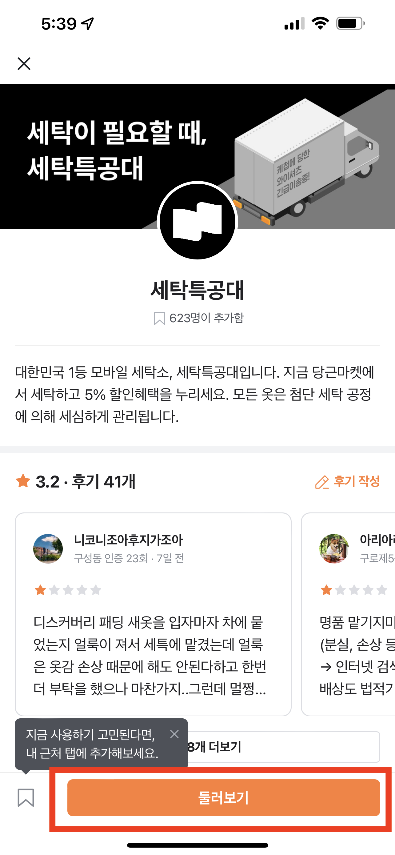 당근마켓 앱 하단 네비게이션에서 내 근처 탭을 누른다. 내 근처 > 당근미니 > 세탁특공대를 클릭하면 업체 소개, 세탁 금액 등을 확인할 수 있다. 하단의 '둘러보기' 버튼을 누른다.