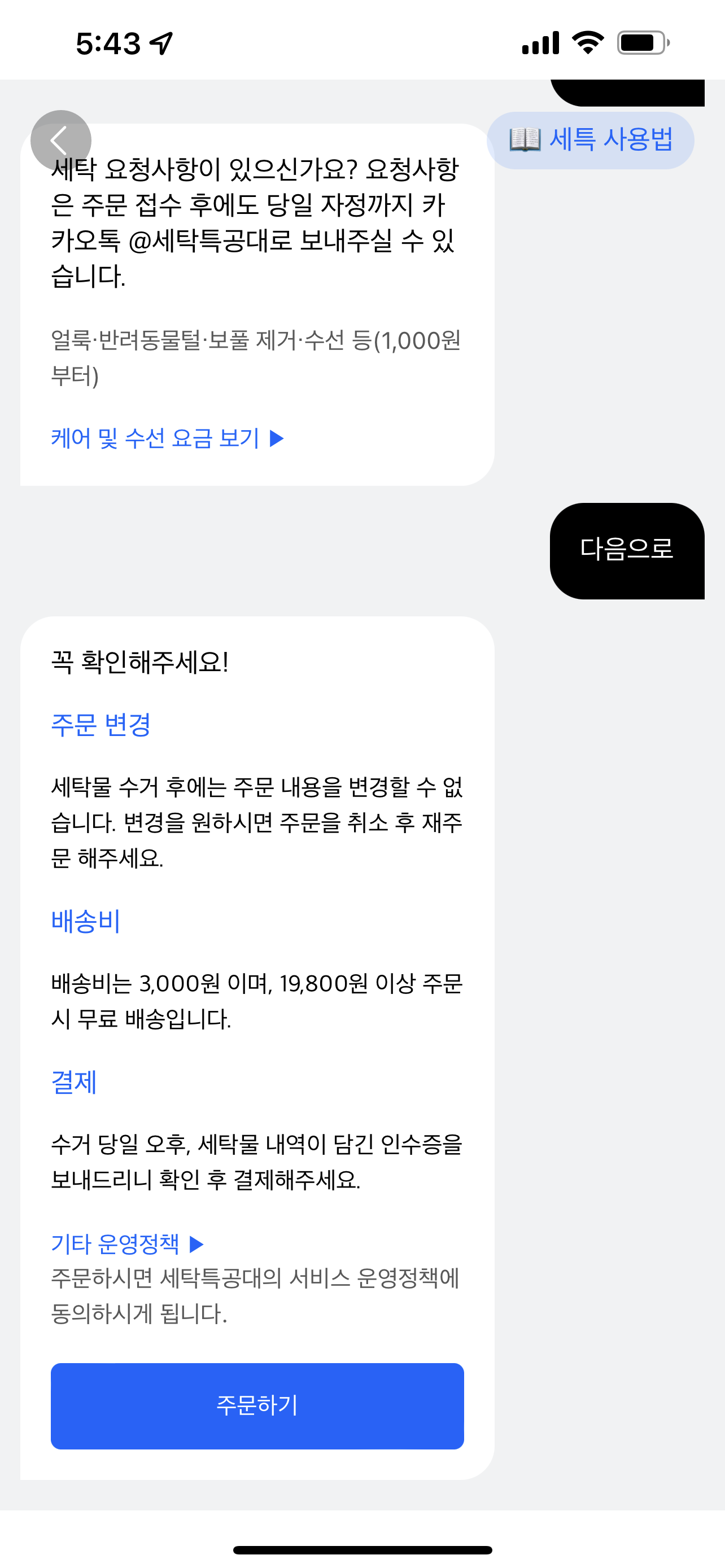 세탁 순서를 확인한 후에 세탁 신청하기 버튼을 누르면 주소, 연락처 등을 확인하는 채팅창이 열린다. 정보를 모두 입력한 후에 최종 주문하기 버튼을 눌러서 주문을 완료할 수 있다. 다음날 오전 7시 전에 배송기사가 세탁물을 수거할 예정이라고 한다.