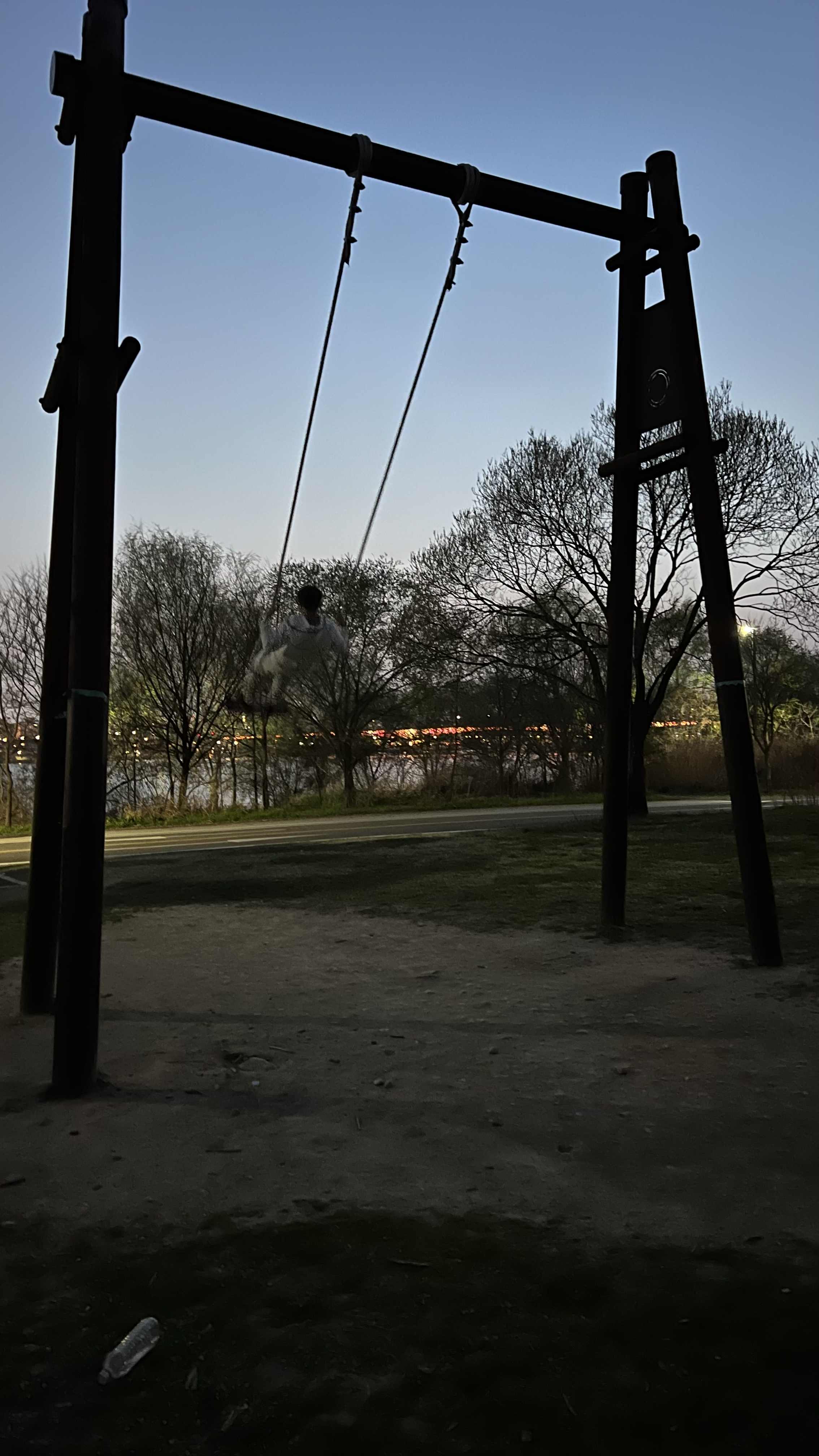 밥을 먹고 우리는 소화도 시킬 겸해서 캠핑장 근처를 가볍게 산책했다. 늦은 점심을 먹었을 뿐인데 벌써 날이 어두워져 버렸다. 난지캠핑장에서 조금 걸으면 바로 한강으로 이어져 있다. 자전거 라이딩을 하는 사람들도 있고 벤치에서 맥주를 마시는 사람들도 있었다. 커다란 그네가 있어서 번갈아가며 타보기도 했다.