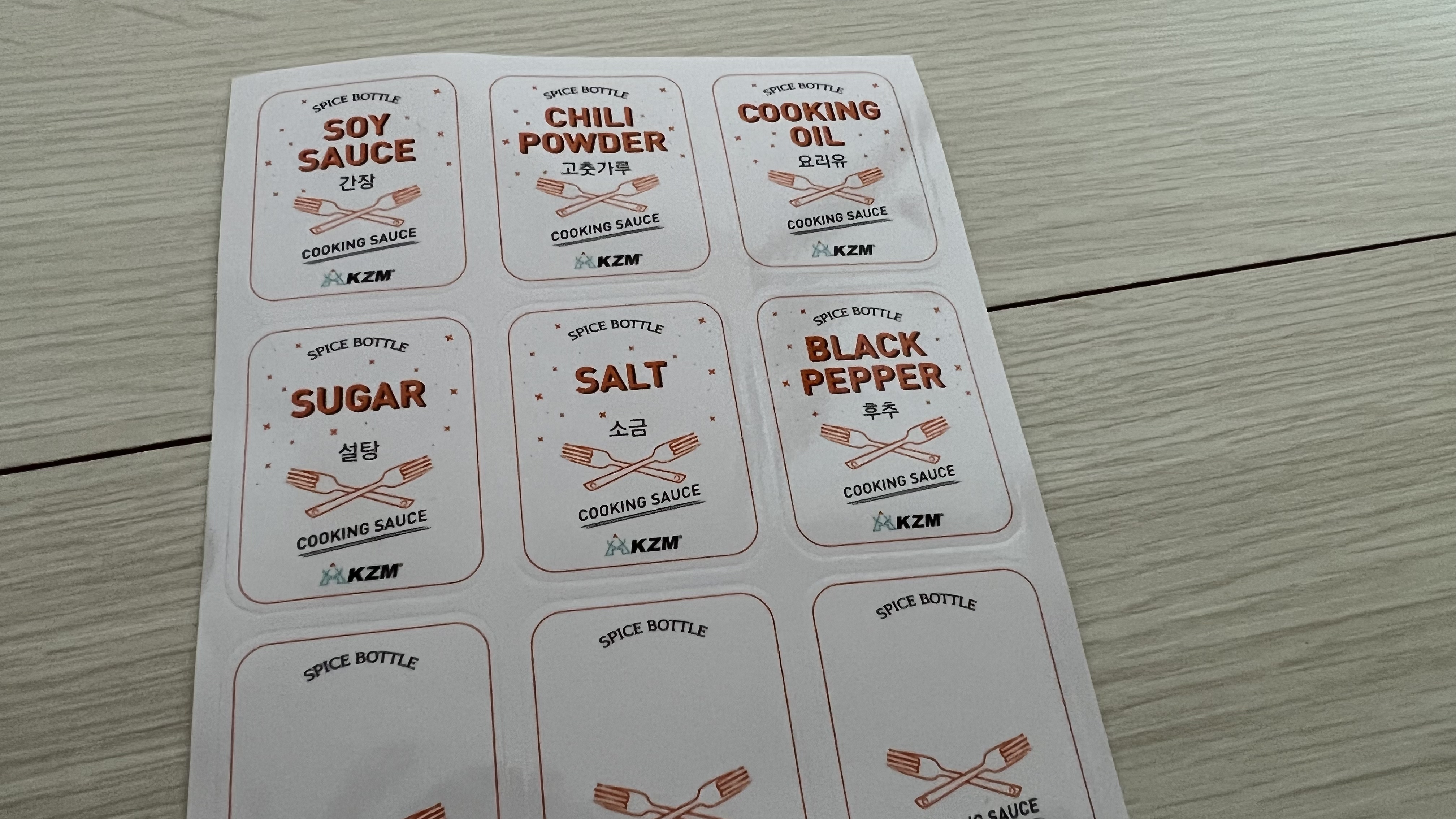 간장, 고춧가루, 설탕, 소금 등 조미료 이름이 적혀있는 스티커도 함께 동봉되어 있다.