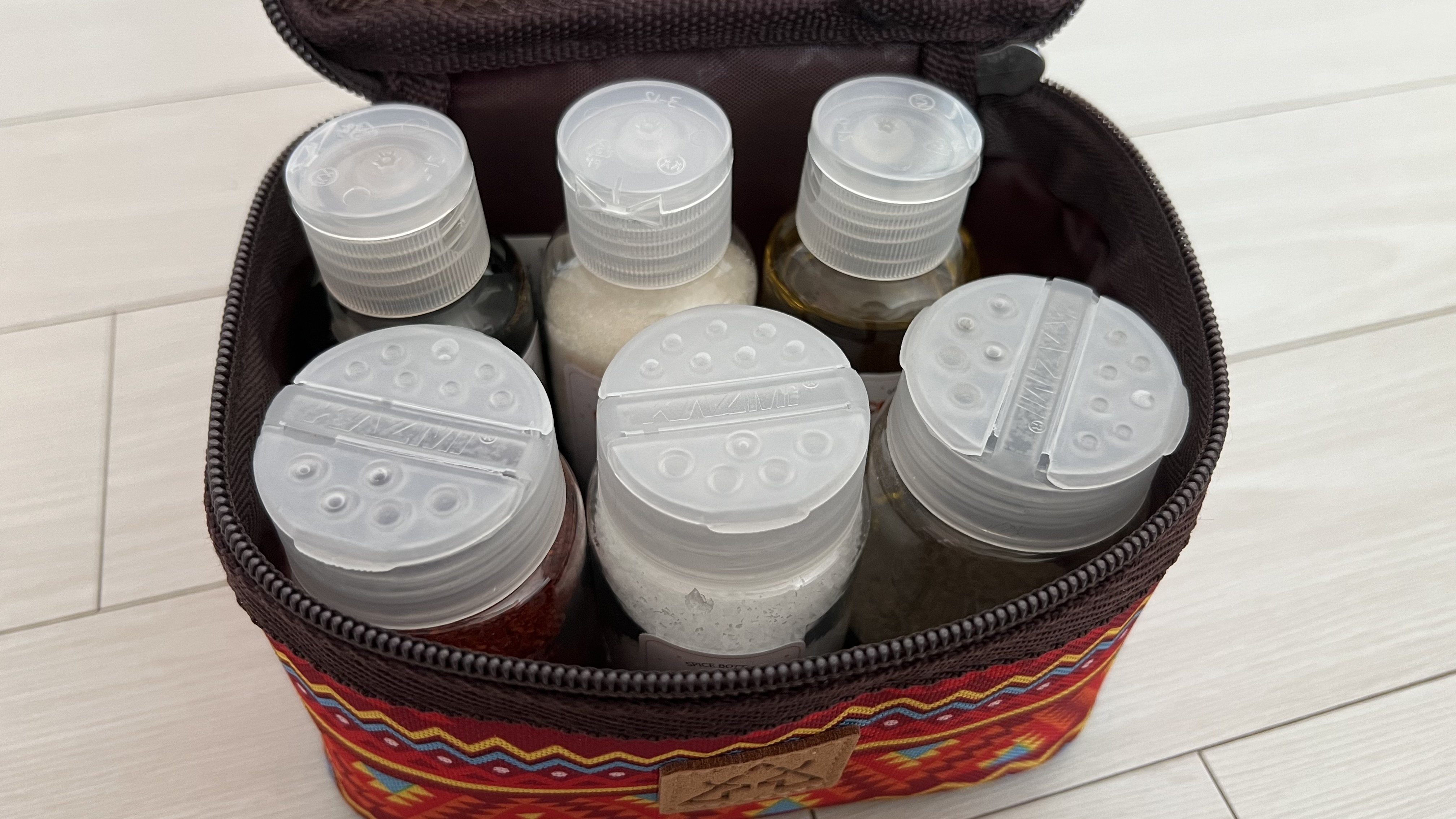 선택한 것은 카즈미(KZM) 브랜드의 스파이스 박스S였다. 2가지 사이즈의 양념통과 파우치 구성으로 보관 및 이동이 간편하고 내부에 메쉬 포켓이 있어서 편리하게 사용이 가능하다고 한다.