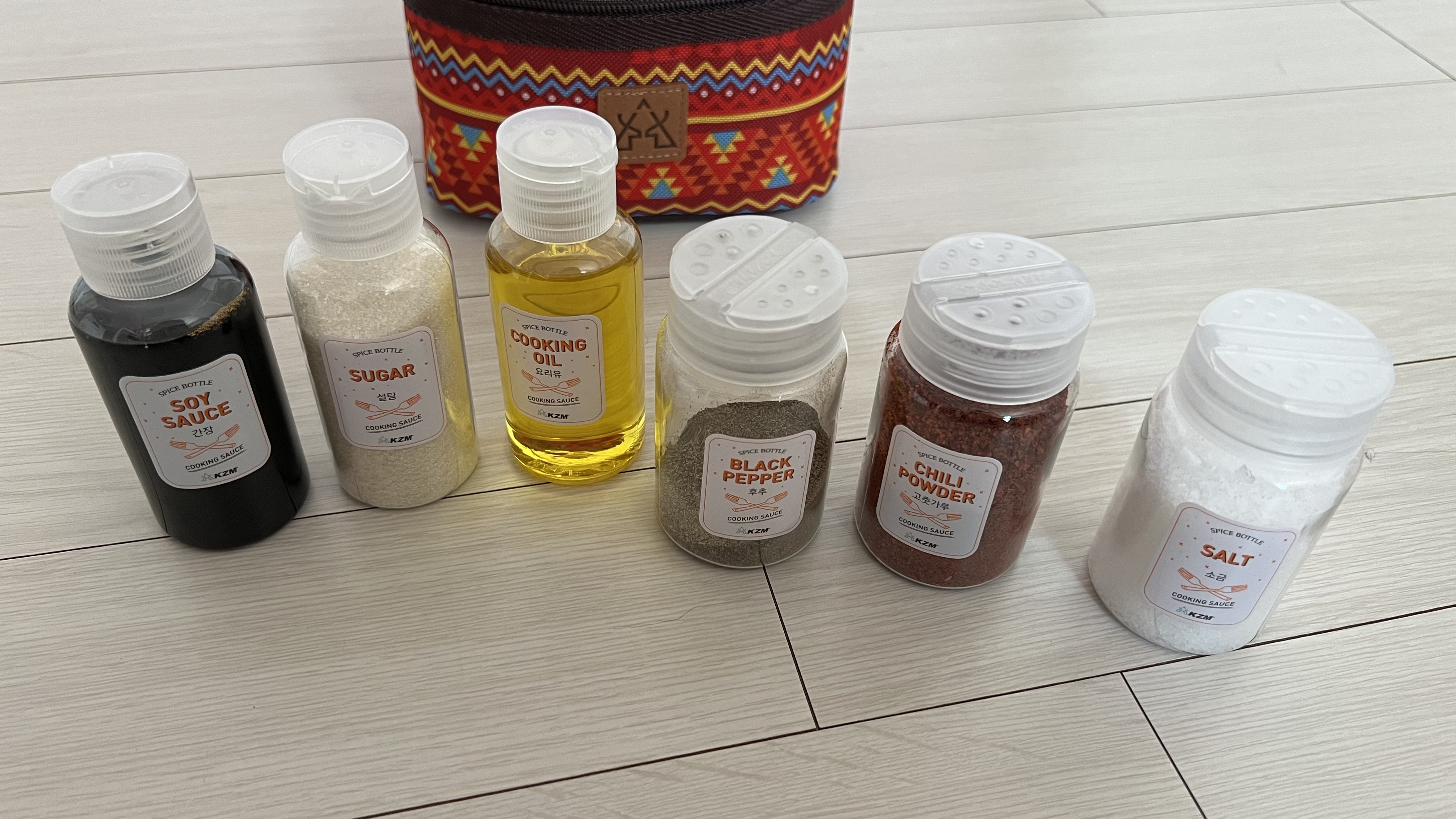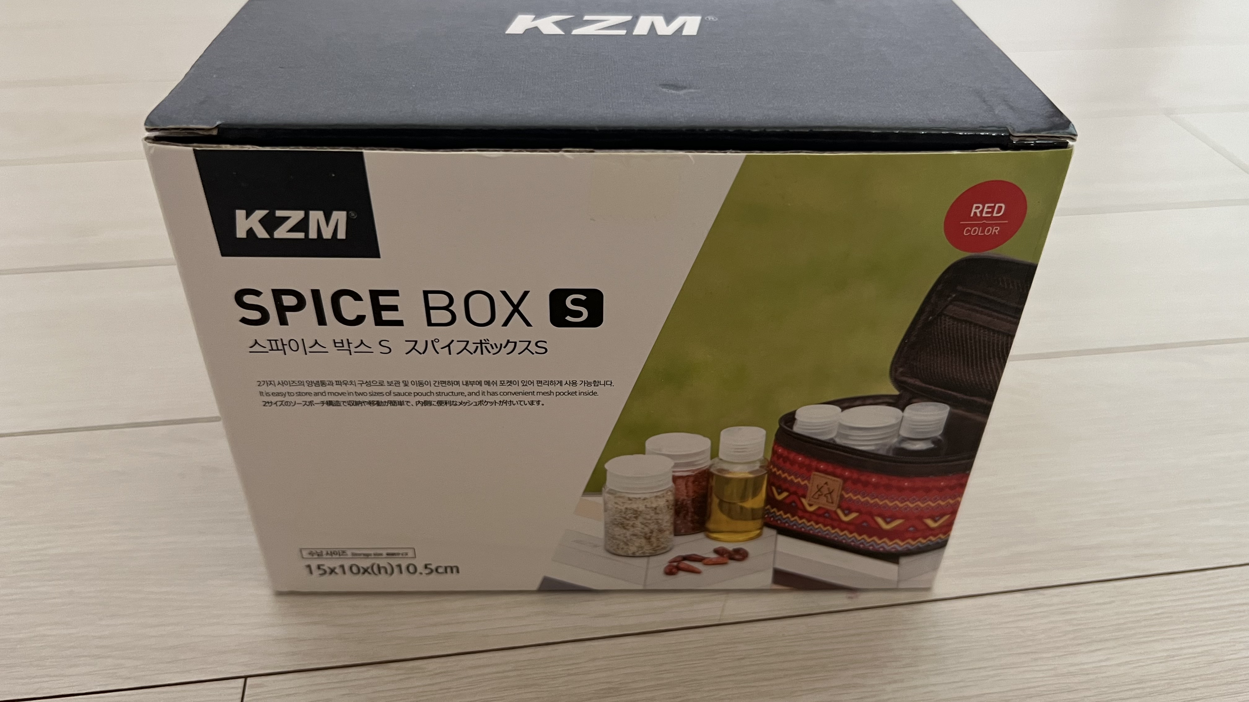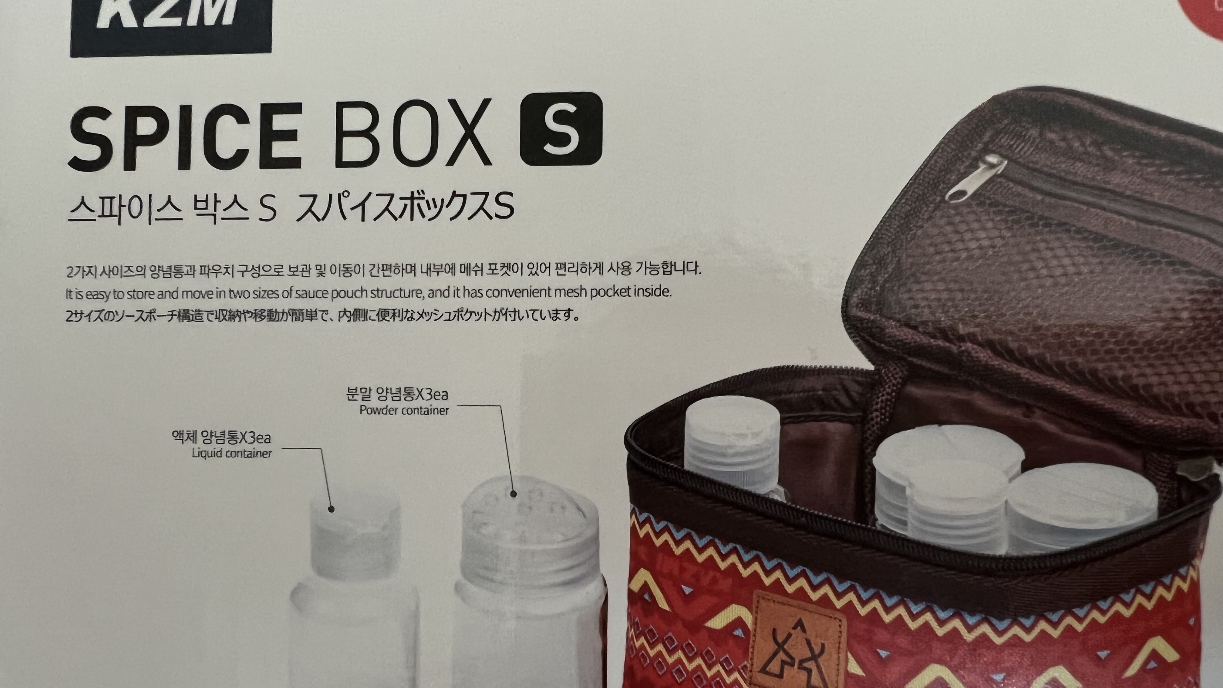 선택한 것은 카즈미(KZM) 브랜드의 스파이스 박스S였다. 2가지 사이즈의 양념통과 파우치 구성으로 보관 및 이동이 간편하고 내부에 메쉬 포켓이 있어서 편리하게 사용이 가능하다고 한다.