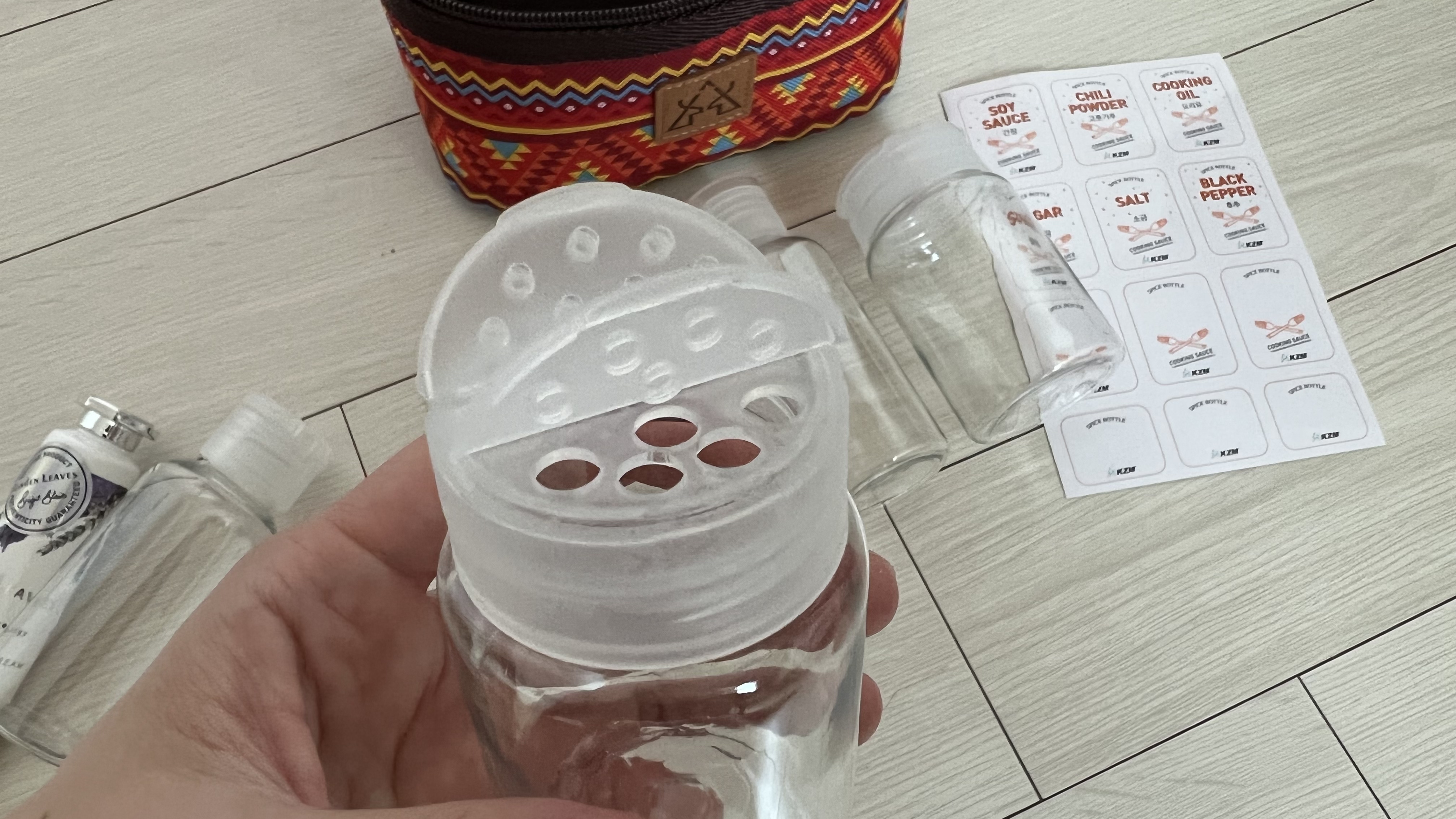 간장, 고춧가루, 설탕, 소금 등 조미료 이름이 적혀있는 스티커도 함께 동봉되어 있다.