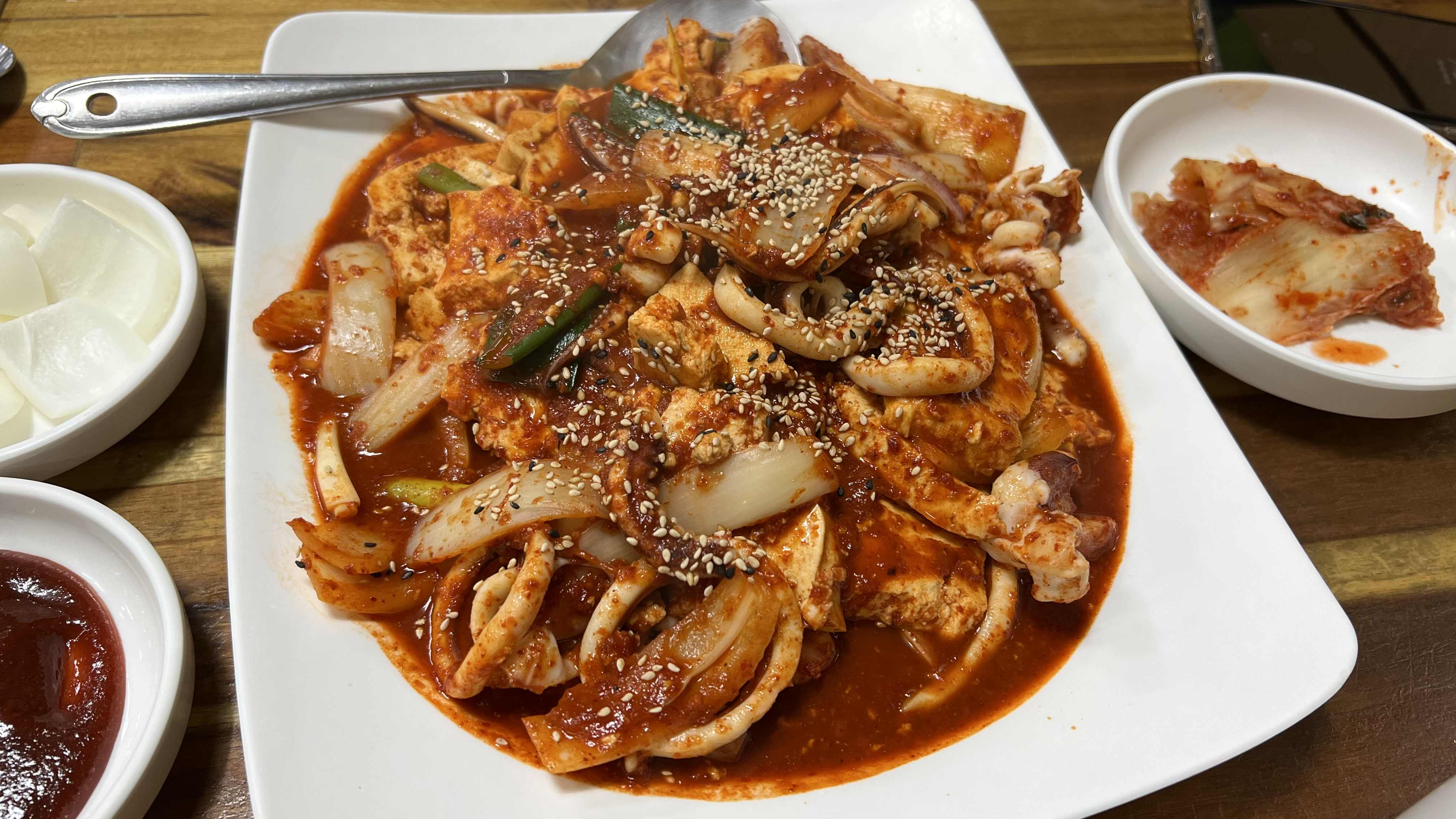 매운 음식을 좋아하긴 하지만 즐기고 잘 먹는 편은 아니라서 '너무 매우면 어쩌나' 하는 걱정도 조금 했었는데, 실제로 먹어보면 보이는 것보다는 훨씬 덜 맵다. 그리고 고소하고 담백한 두부와 쫄깃한 오징어가 양념맛을 워워~ 해주는 효과가 있어서 맛있게 먹을 수 있었다.