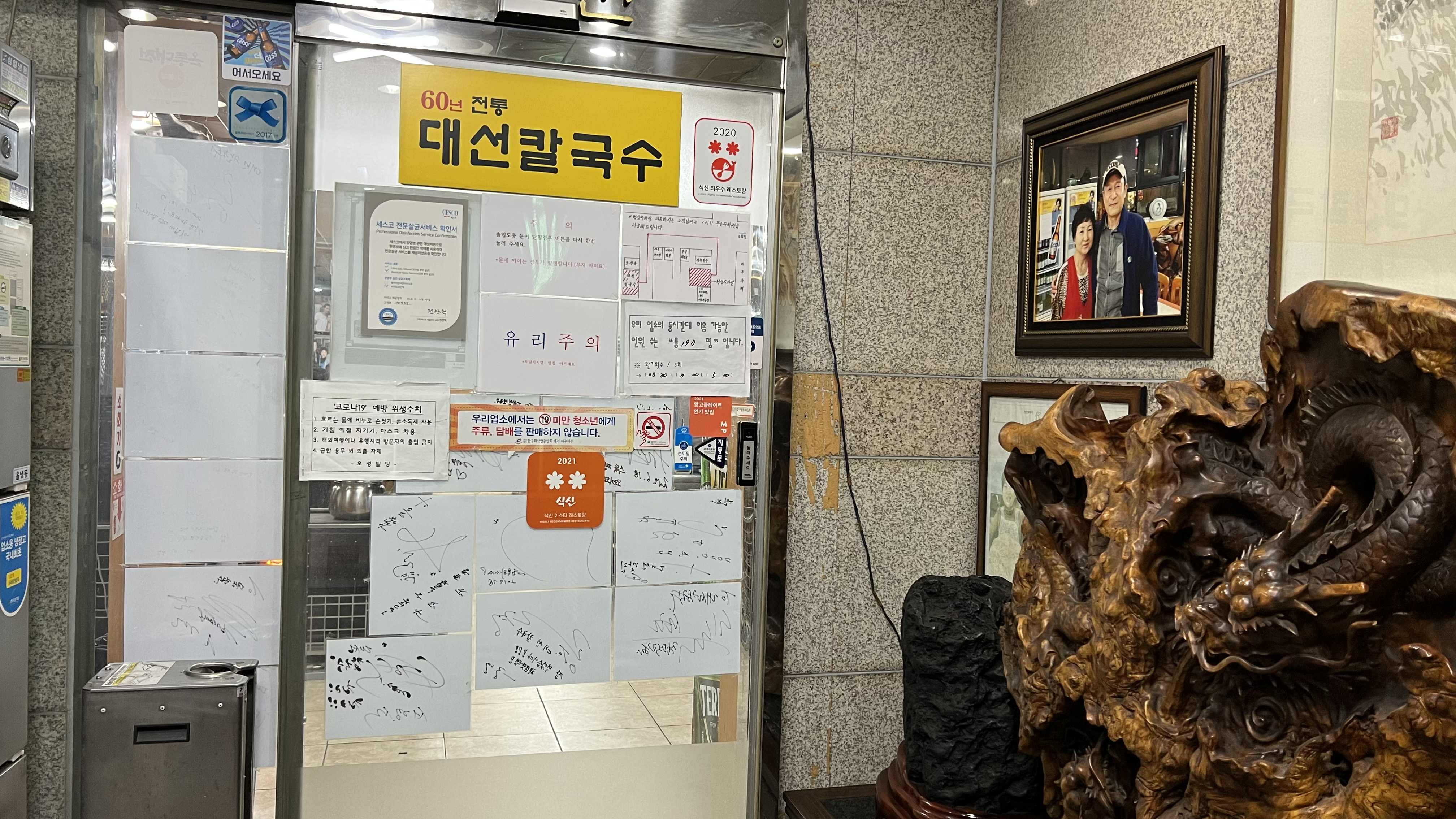 오성빌딩 건물 2층에 위치해 있는 대선칼국수는 60년 전통을 자랑하듯 여기저기 유명인사들의 싸인이 붙어 있었다. 우리는 칼국수와 오징어 두부두루치기를 주문했다.