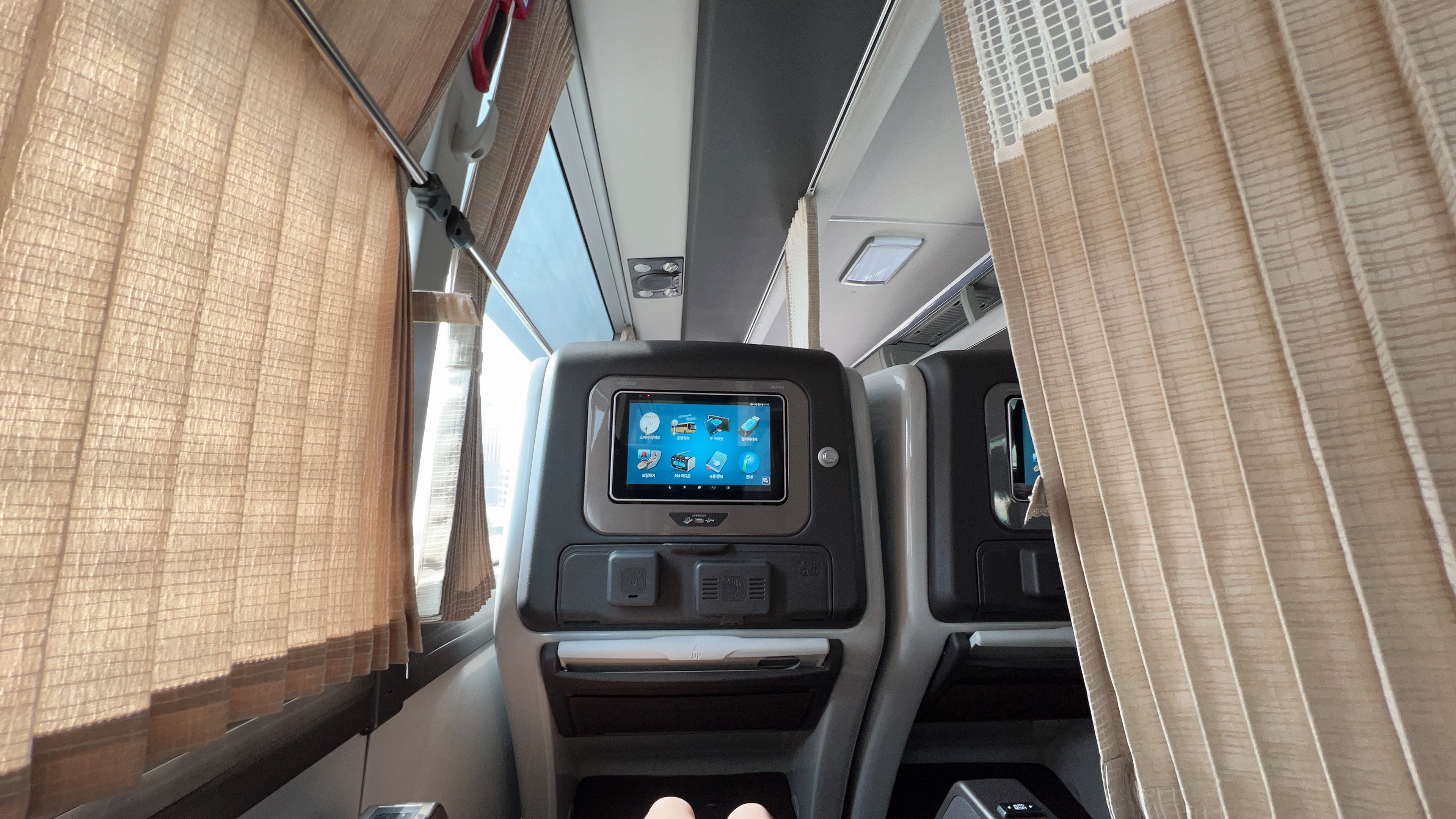 스마트폰을 충전할 수 있는 포트가 있는 것도 마음에 들었는데, 그 무엇보다 좋았던 것은 푹신하고 편안한 시트와 개인 공간이 넓게 확보되어 있다는 점이었다. 발판 부분과 등받이 부분 각도 조절이 가능한데, 뒷자리에 방해되지 않고 완전히 뒤로 젖히는 것이 가능하다. 일반 버스의 경우 등받이를 뒤로 젖히면 뒷자리에 앉은 사람에게 방해가 되어 눈치가 보이는데, 프리미엄 버스의 경우 뒷자리를 전혀 침범하지 않는다.