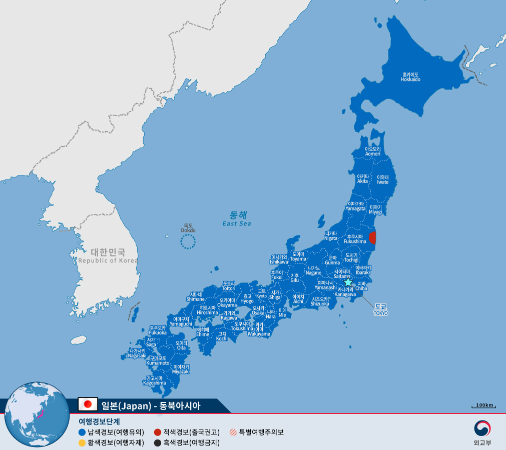 외교부 해외안전여행 홈페이지에 나와있는 정보에 따르면 일본은 현재 대부분의 지역이 남색경보(여행유의)이다. 후쿠시마 원전 반경 30km 이내 혹은 일본 정부 지정 피난지시구역이 아니라면 여행이 가능하다.