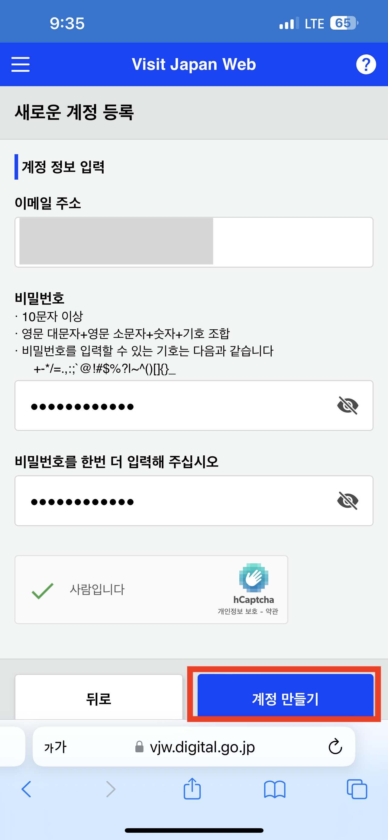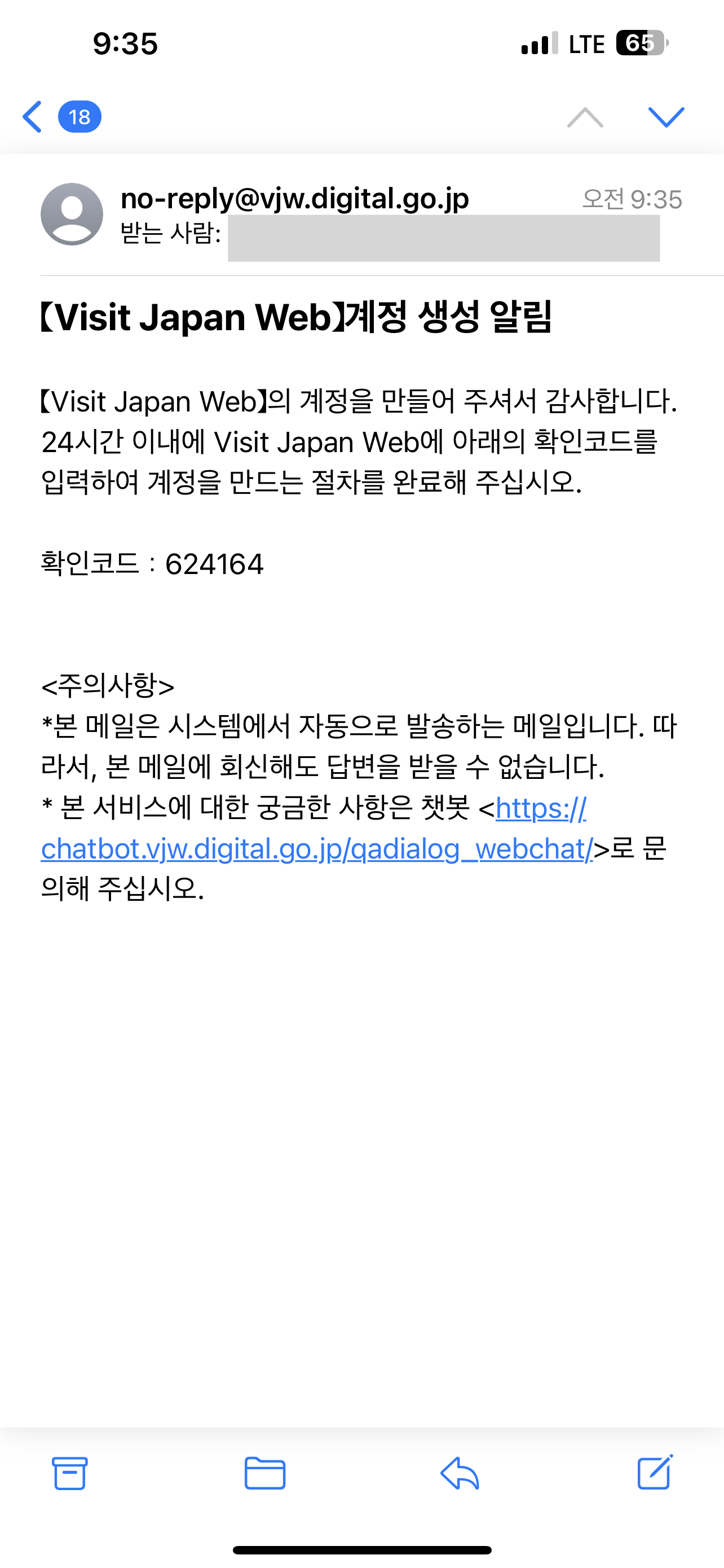 그러면 화면이 바뀐다. 실제로 사용하고 있는 이메일 주소를 입력하고 비밀번호를 설정하고 나면 등록한 이메일 주소에 대한 본인 확인이 필요하다고 한다. 이메일을 확인해보니 Visit Japan Web에서 보낸 확인코드 메일이 도착해 있었다. 이 확인코드를 다시 사이트에 입력하고 '이메일 주소 확인' 버튼을 클릭한다.