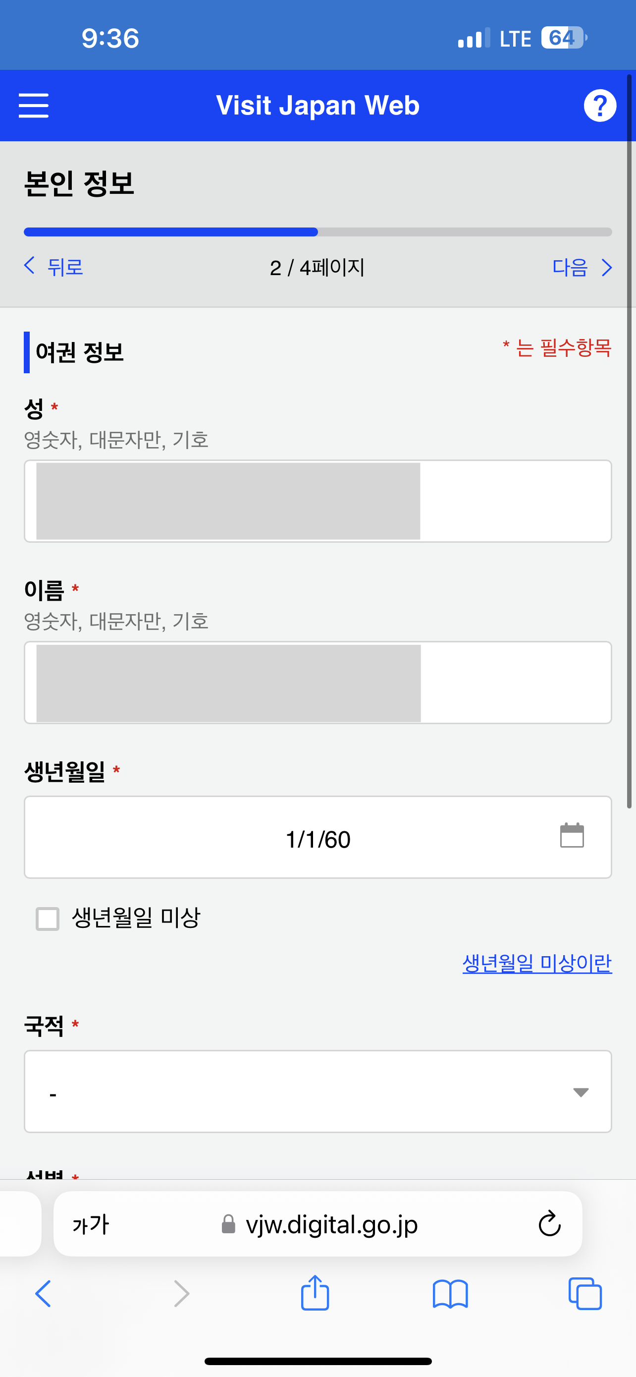 이용자 등록도 회원가입만큼이나 간단하다. 로그인을 진행한 후에 화면에서 이용자 등록 > 본인정보 버튼을 선택한다. 일본 정부가 발행한 여권 소지 여부, 재입국 허가 여부를 선택한 후에 여권 정보(성, 이름, 생년월일 등)를 입력한다.