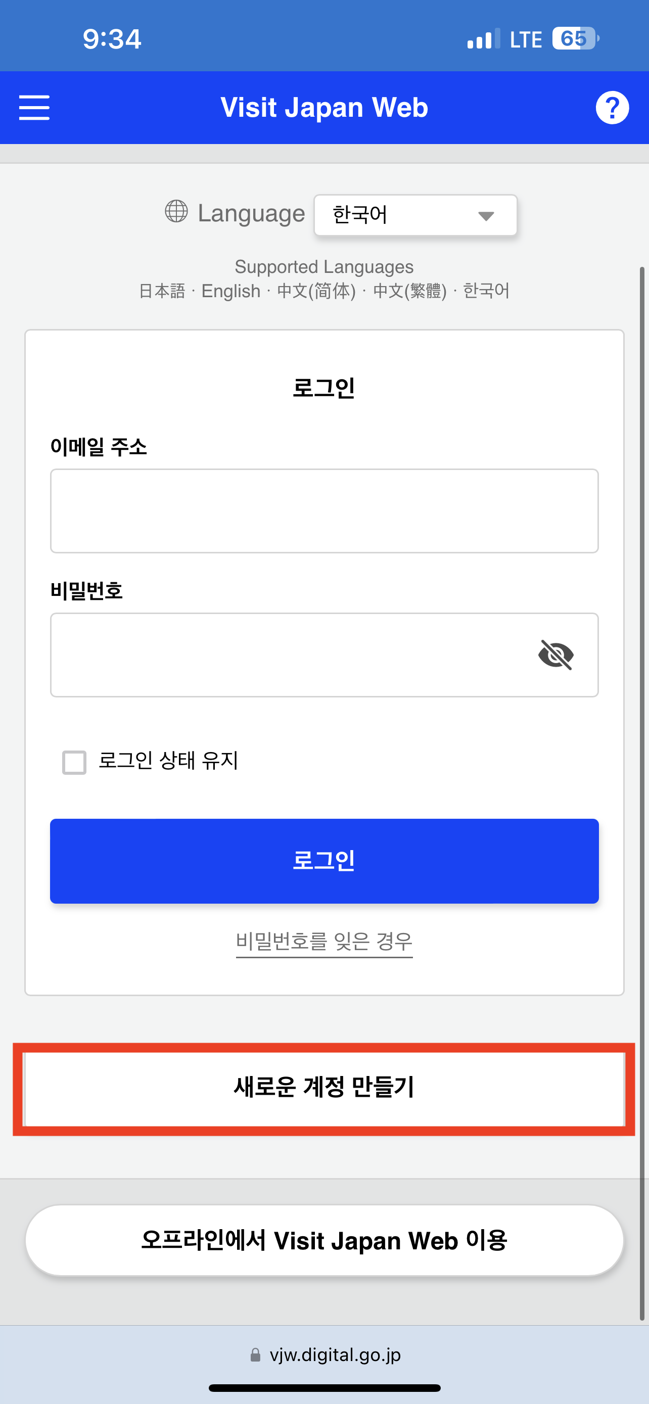Language를 Korean(한국어)로 변경하고 아래로 스크롤을 내리면 QR 코드 아래에 인터넷 주소 하나가 보일 것이다. https://www.vjw.digital.go.jp 클릭하면 Visit Japan Web 로그인 화면으로 이동한다.