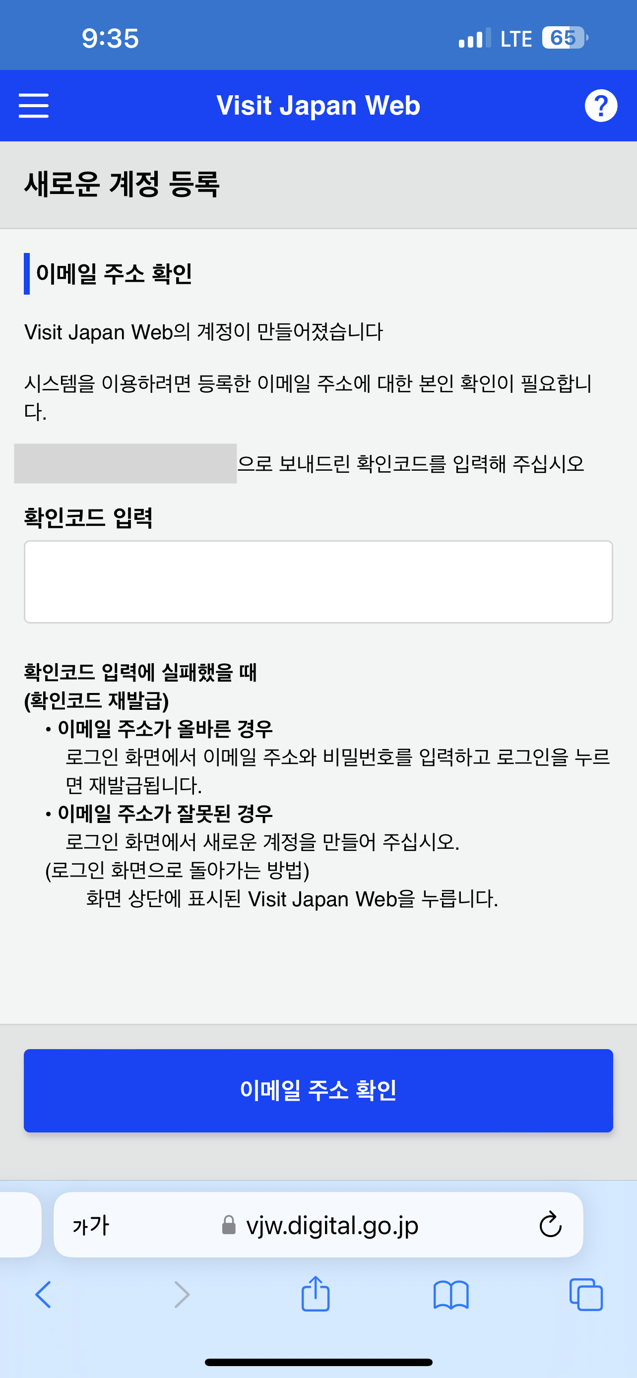 그러면 화면이 바뀐다. 실제로 사용하고 있는 이메일 주소를 입력하고 비밀번호를 설정하고 나면 등록한 이메일 주소에 대한 본인 확인이 필요하다고 한다. 이메일을 확인해보니 Visit Japan Web에서 보낸 확인코드 메일이 도착해 있었다. 이 확인코드를 다시 사이트에 입력하고 '이메일 주소 확인' 버튼을 클릭한다.