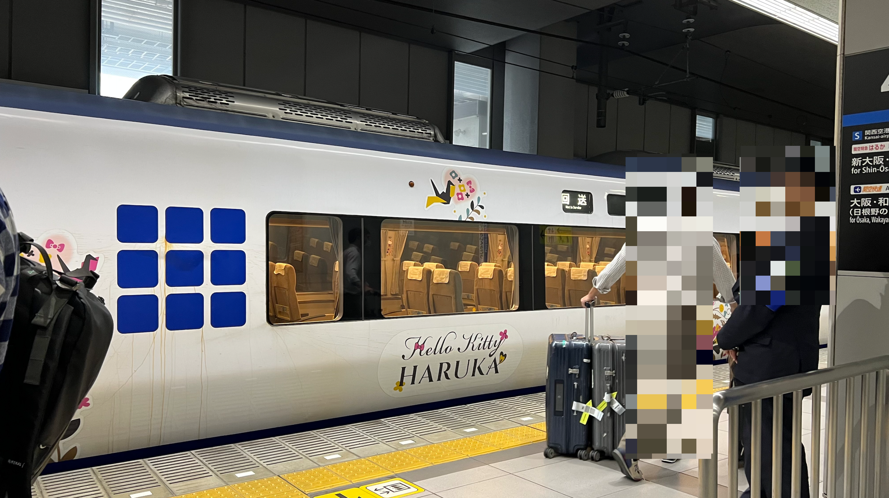 타이밍 좋게도 조금 기다리니 바로 하루카 특급열차가 도착했다. Hello Kitty HARUKA 라고 적혀 있는 예쁘게 생긴 열차였다. 객실과 객실을 연결하는 통로에 짐을 넣어둘 수 있는 공간이 있어서 캐리어는 그 곳에 보관했다.