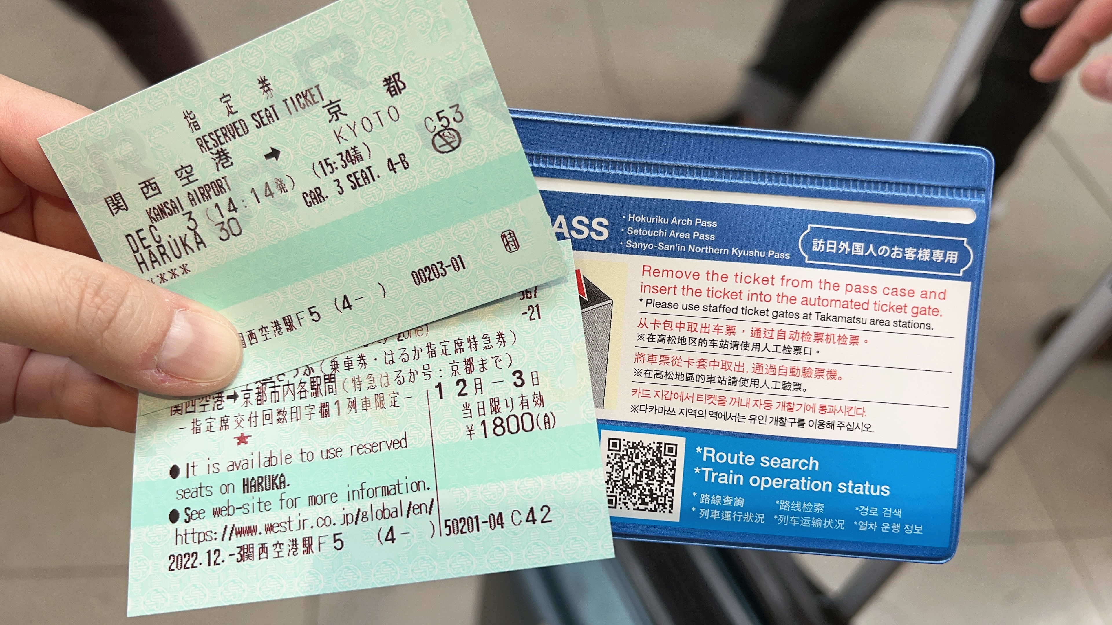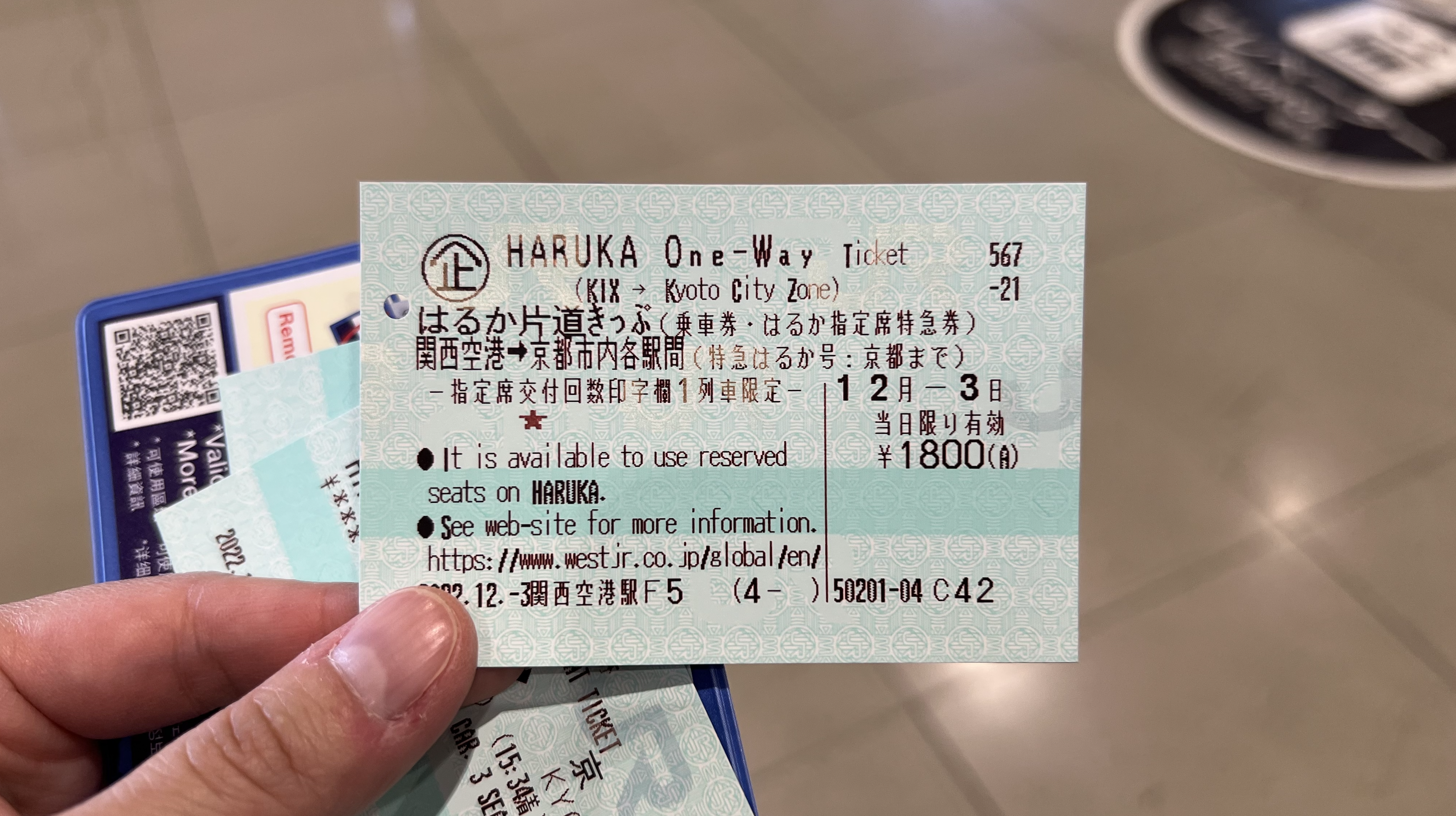 드디어 티켓을 수령했다. 우리는 오후 2시 14분에 출발하는 하루카 특급 열차의 CAR. 3 SEAT 4-A, 4-B 지정석이었다. 참고로 하루카는 자유석도 있는데, 이건 사람들이 많으면 앉아서 갈 수 없다. 다만 간사이 국제공항과 교토 모두 종착역이기 때문에 매우 높은 확률로 자리를 확보하는 것이 가능하며, 서서 가는 것이 싫다면 다음 열차를 기다리는 선택지도 있으니 큰 걱정은 하지 않아도 될 것 같다.