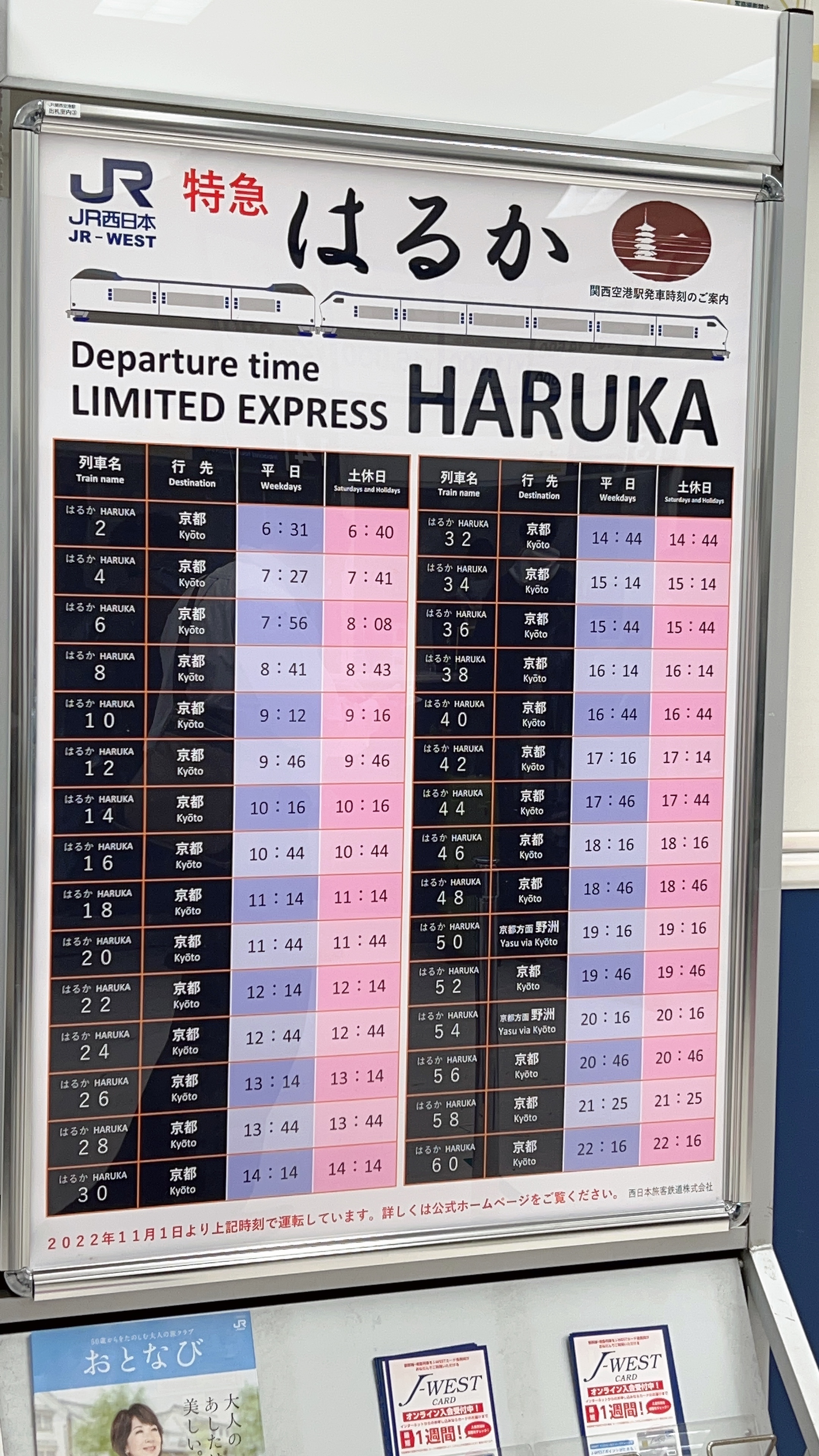 하루카 특급 열차의 운행시간표는 아래와 같다. 대체로 비슷하긴 하지만 오전(9시 이전)에는 평일과 주말 출발 시간이 약간 다르다. 아래 표를 참고하면 좋을 것 같다. (2022년 12월 기준)