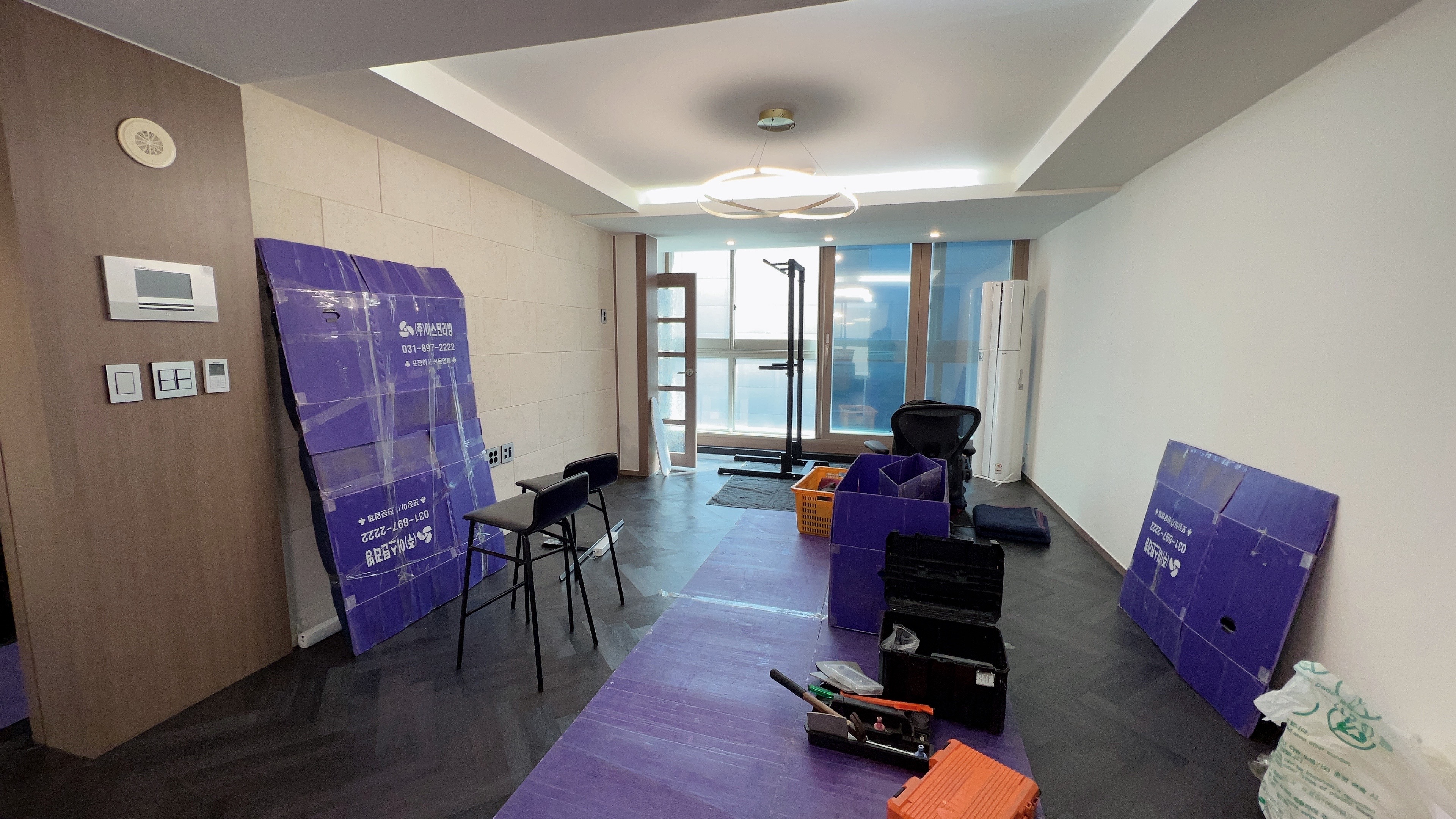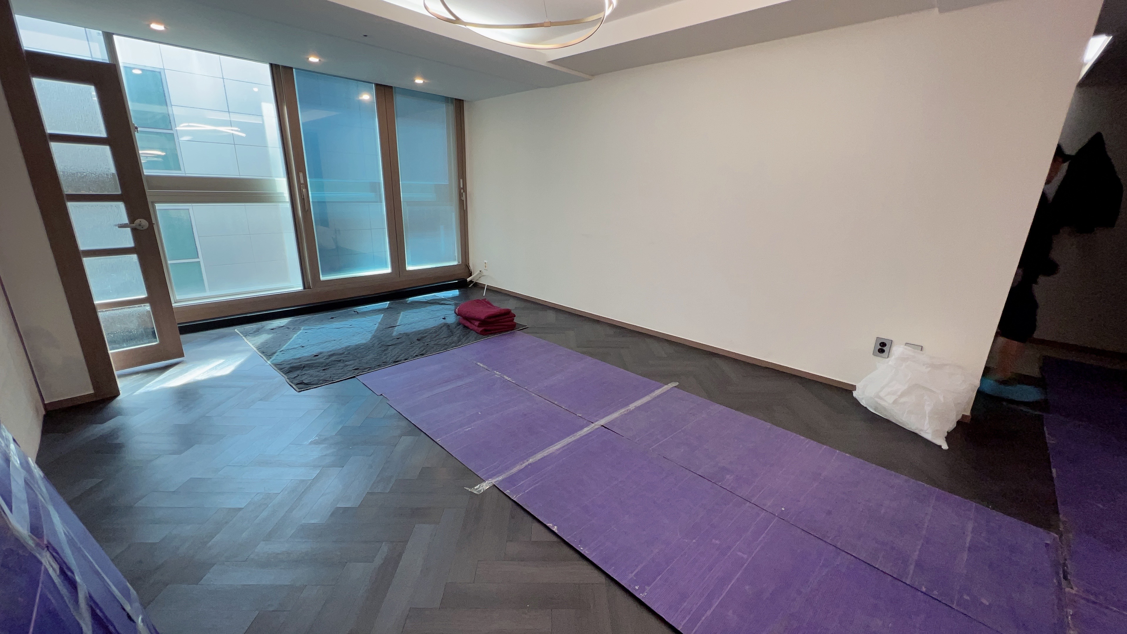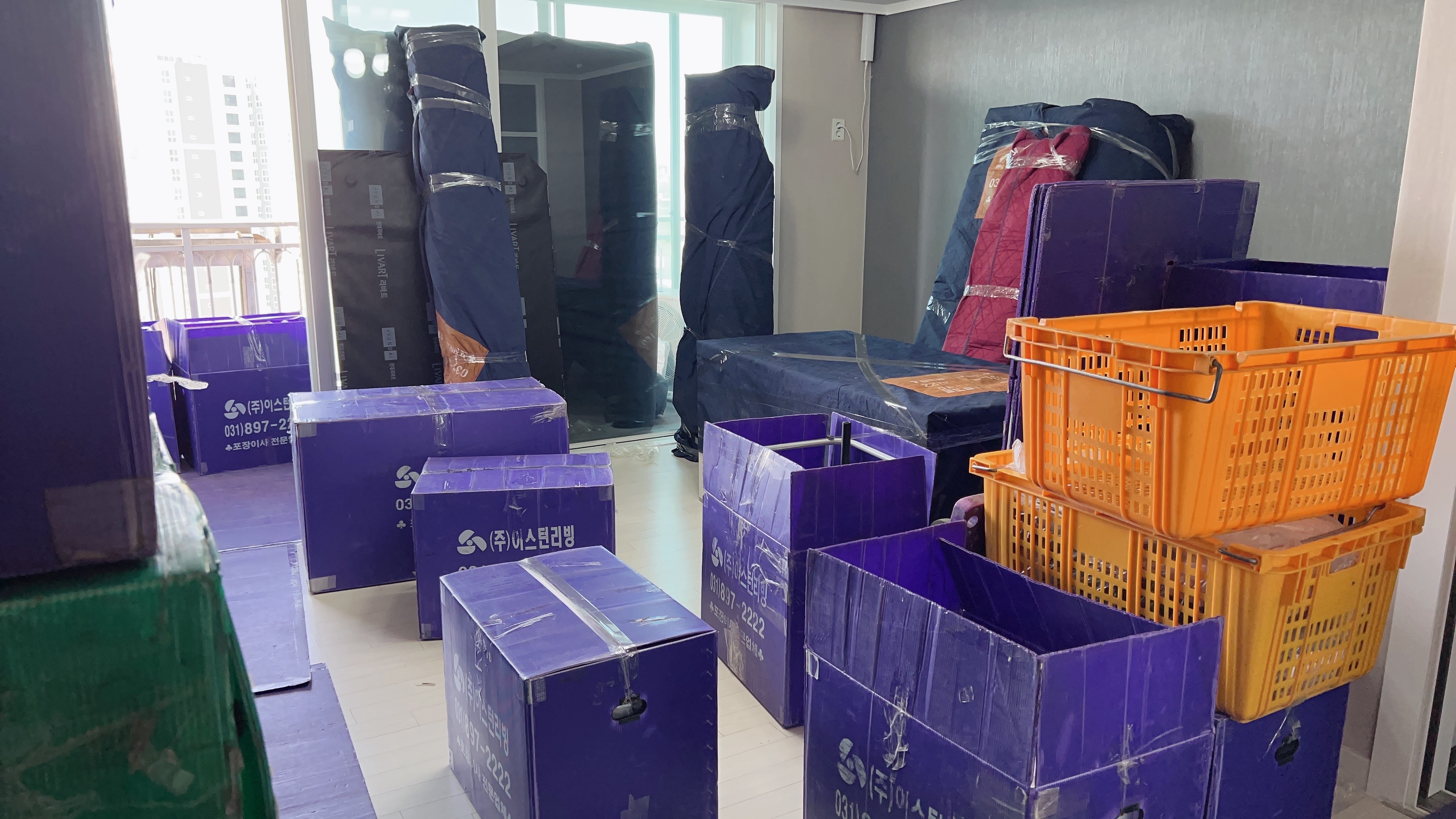 이사는 오전 8시 ~ 8시 30분쯤부터 시작되었다. 아침잠이 많은 우리는 일찍 일어나는 것이 몹시 힘들었다. (회사는 도대체 어떻게 다니는건지...) 제일 먼저 하는 일은 짐을 이동시킬 때에 바닥이 상하지 않도록, 동선을 고려하여 포장재 붙이기였다. 들었던 대로 정말 우리가 할 일이 하나도 없었고, 이 방 저 방 옮겨다니면서 방해가 되지 않도록 노력만 하면 되었다.