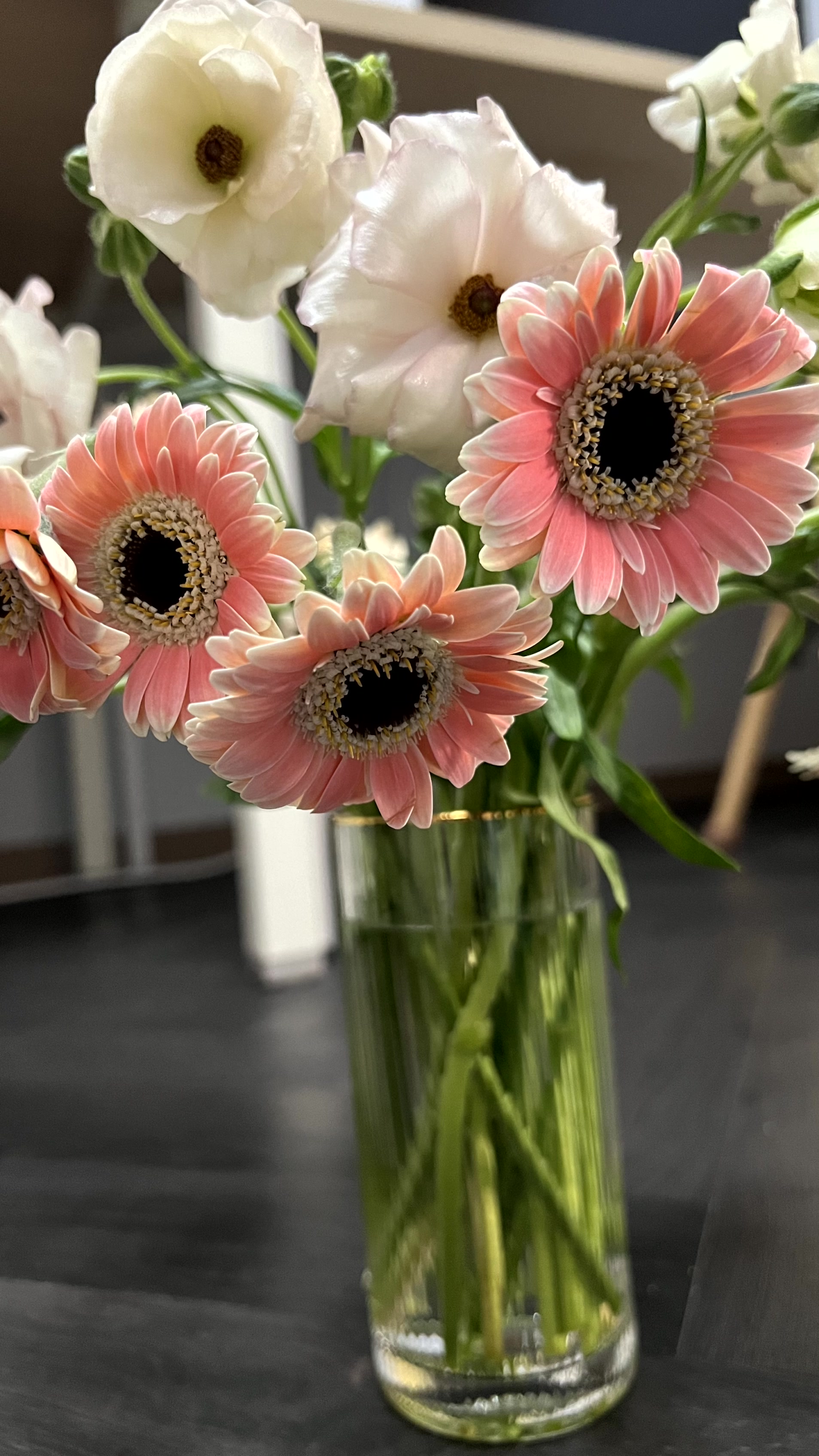 화병을 구입할 때 함께 배송된 거베라와 따로 구입한 라넌큘러스 아리아드네라는 꽃을 화병에 꽂아 주었다. 꾸까 상세페이지나 다른 사람들이 꽃꽂이 해놓은 사진을 보면 정말 예쁜데, 내가 직접 하니 어렵고 마음에 들지 않았다. 역시 세상에는 쉬운 게 하나도 없다. 이것도 연습을 하는 것 밖에는 다른 방법이 없겠지.