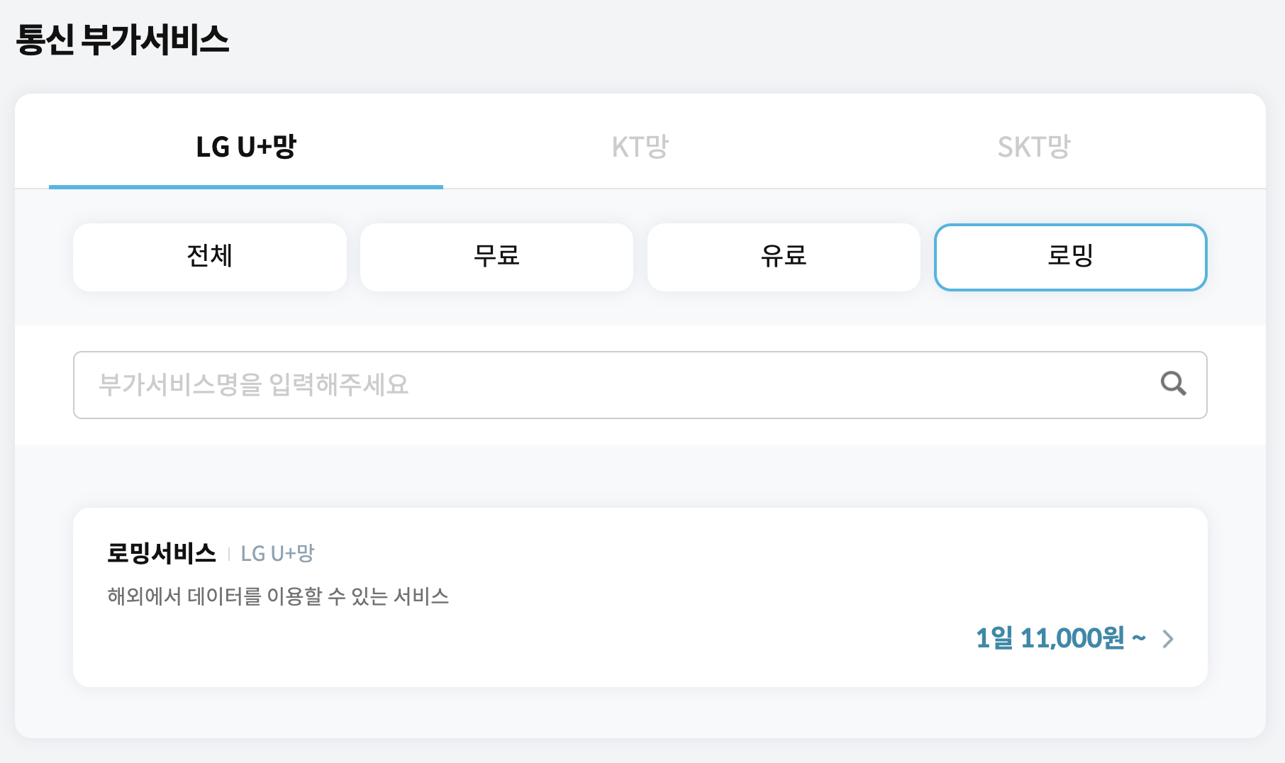 통신 부가서비스에서 내가 사용하는 통신사를 선택하고, 4번째 탭에 있는 '로밍'을 선택하니 하단에 로밍 서비스라는 항목이 나왔다. 1일 11,000원 부터라고 적혀있는 것을 보니 로밍 서비스도 여러가지가 있나 보다. 일단 클릭!