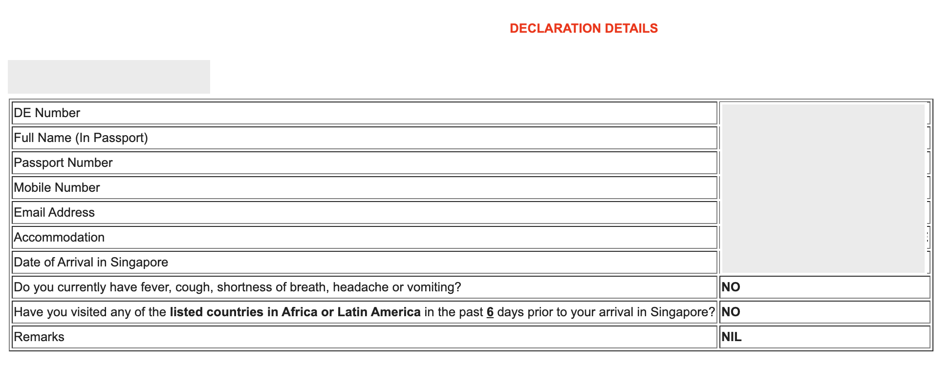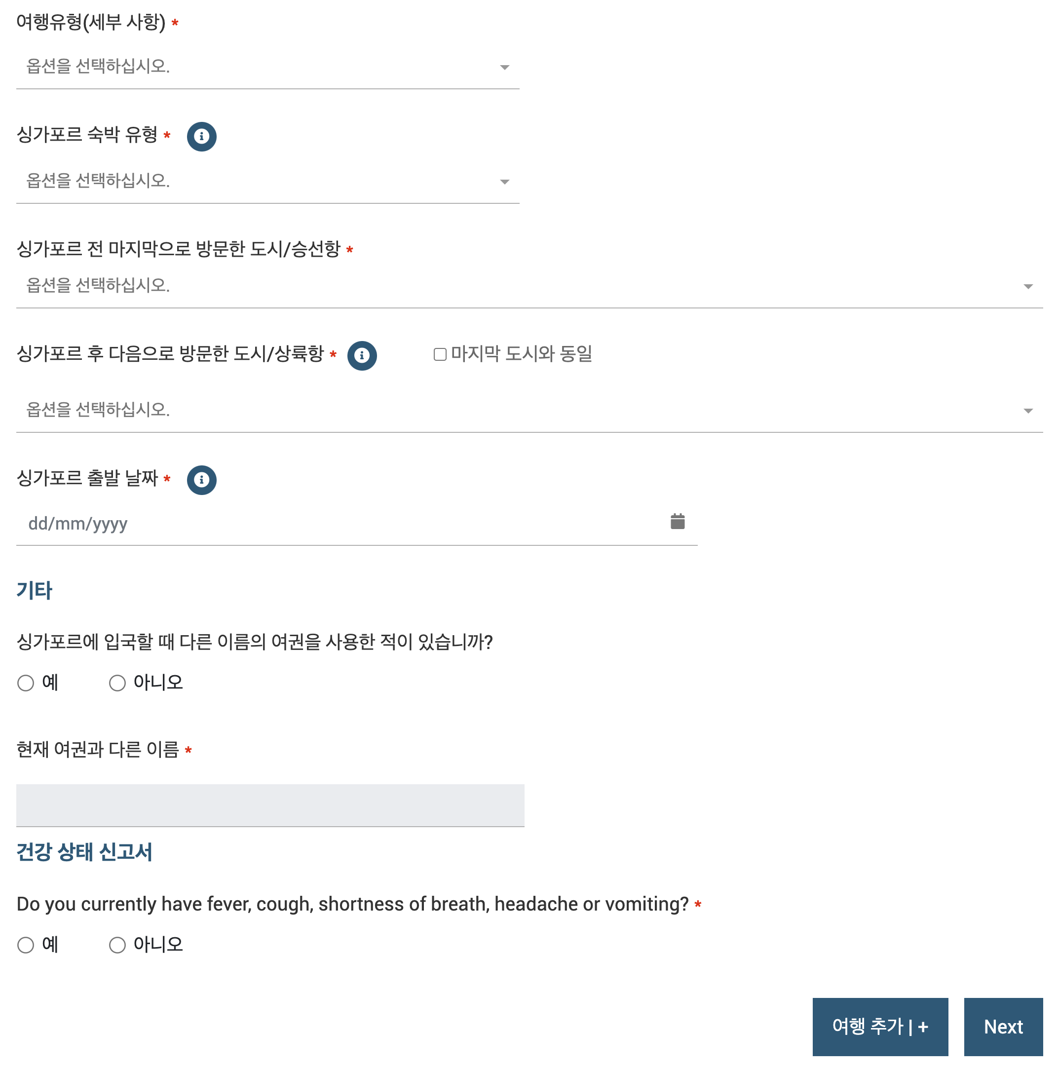 마지막 건강 상태 신고서에는 현재 발열, 기침, 호흡곤란, 두통, 구토 증상이 없다면 '아니오'를 선택하면 된다. 그러면 아래 항목이 새롭게 추가되는데, 싱가포르에 도착하기 전 지난 6일 이내에 아프리카, 중난미에 있는 국가를 방문했냐는 질문이다. 모든 항목을 기입했으면 Next 버튼을 눌러 다음으로 넘어가자.