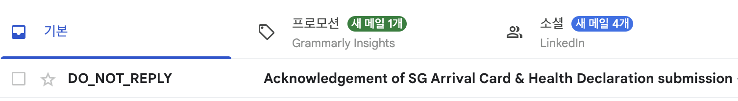 입력한 이메일에 들어가보니 Acknowledgement of SG Arrival Card & Health Declaration submission (SG 입국신고서 및 건강신고서 제출 확인서) 이라는 제목의 메일이 하나 와 있었다.