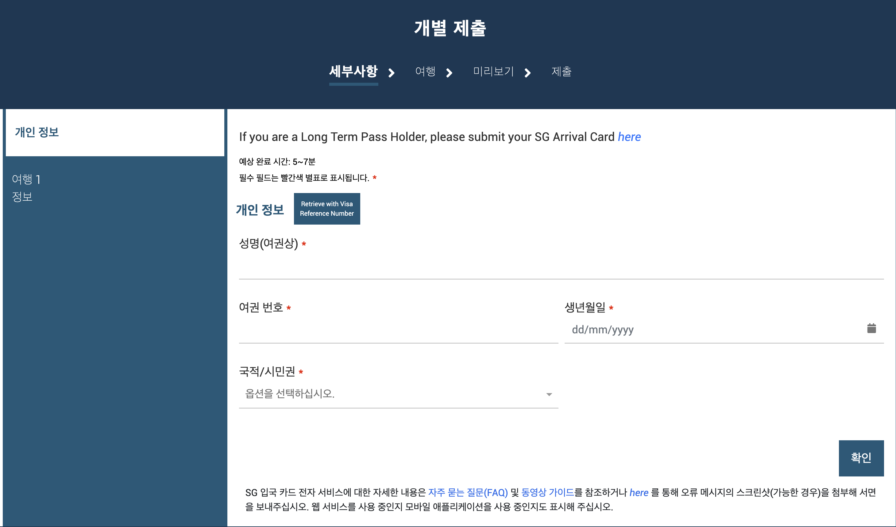 첫 단계는 개인정보 입력단계이다. 이름, 여권번호, 생년월일, 국적 등 개인정보를 입력한다.