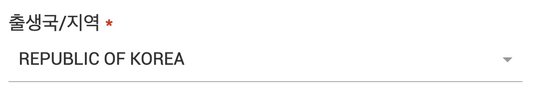 아까 화면에서 국적/시민권 선택할 때에는 KOREA, SOUTH 였는데 이번에 출생국/지역을 선택할 때에는 REPUBLIC OF KOREA 라고 되어 있다. 이런 부분은 표기를 통일해주면 덜 헷갈릴 것 같은데 조금 아쉽다.