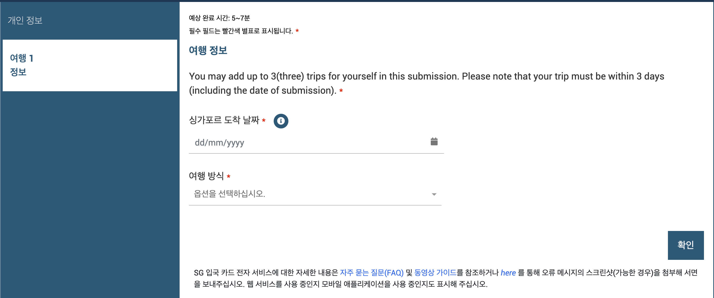 그 다음으로 여행 정보를 입력할 차례이다. 여행은 제출 날짜를 포함하여 3일 이내여야 하며, 최대 3개까지 추가할 수 있다. 싱가포르 도착 날짜를 입력하고, 여행 방식으로는 나는 비행기를 타고 갈 예정이라 항공을 선택했다.