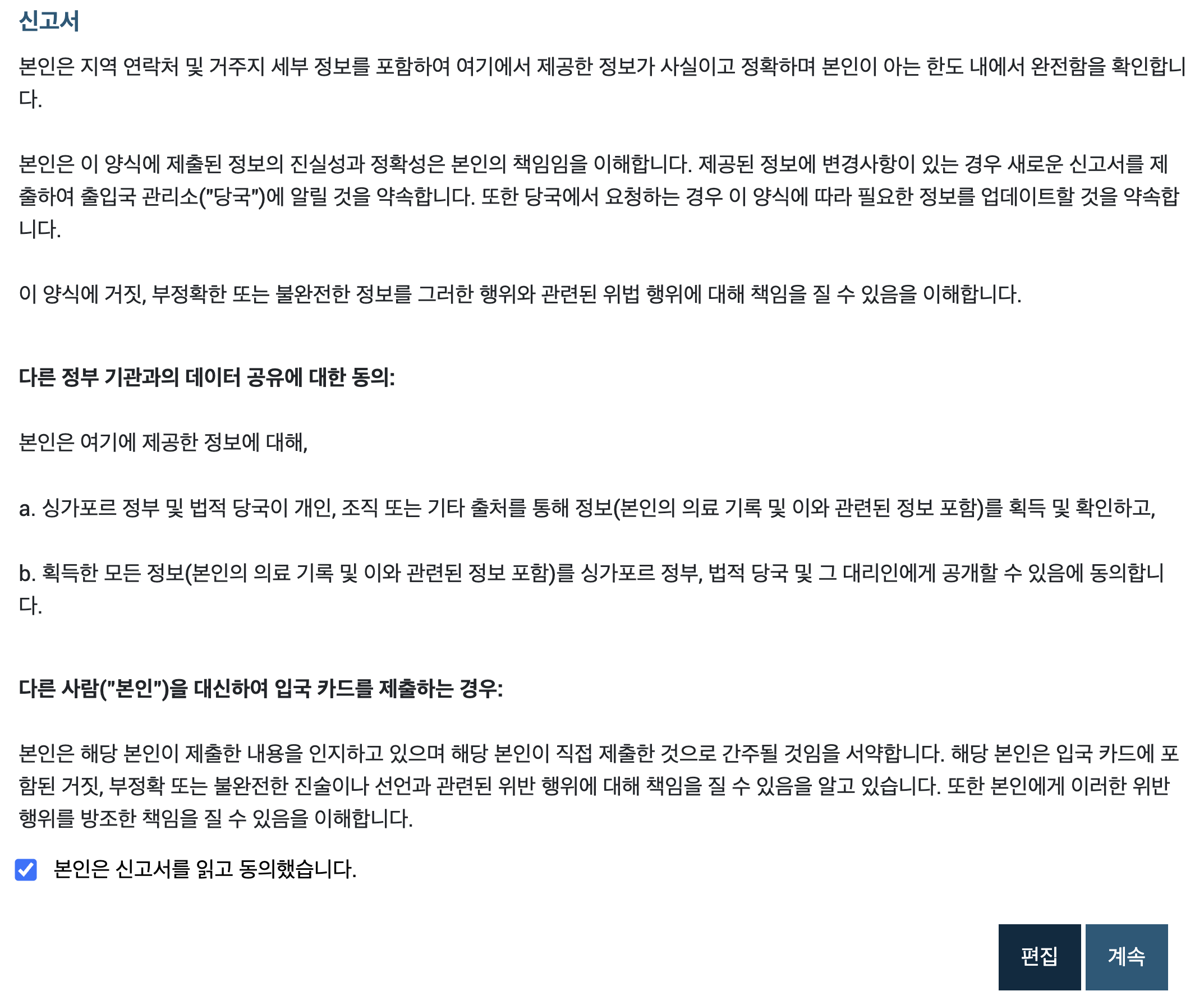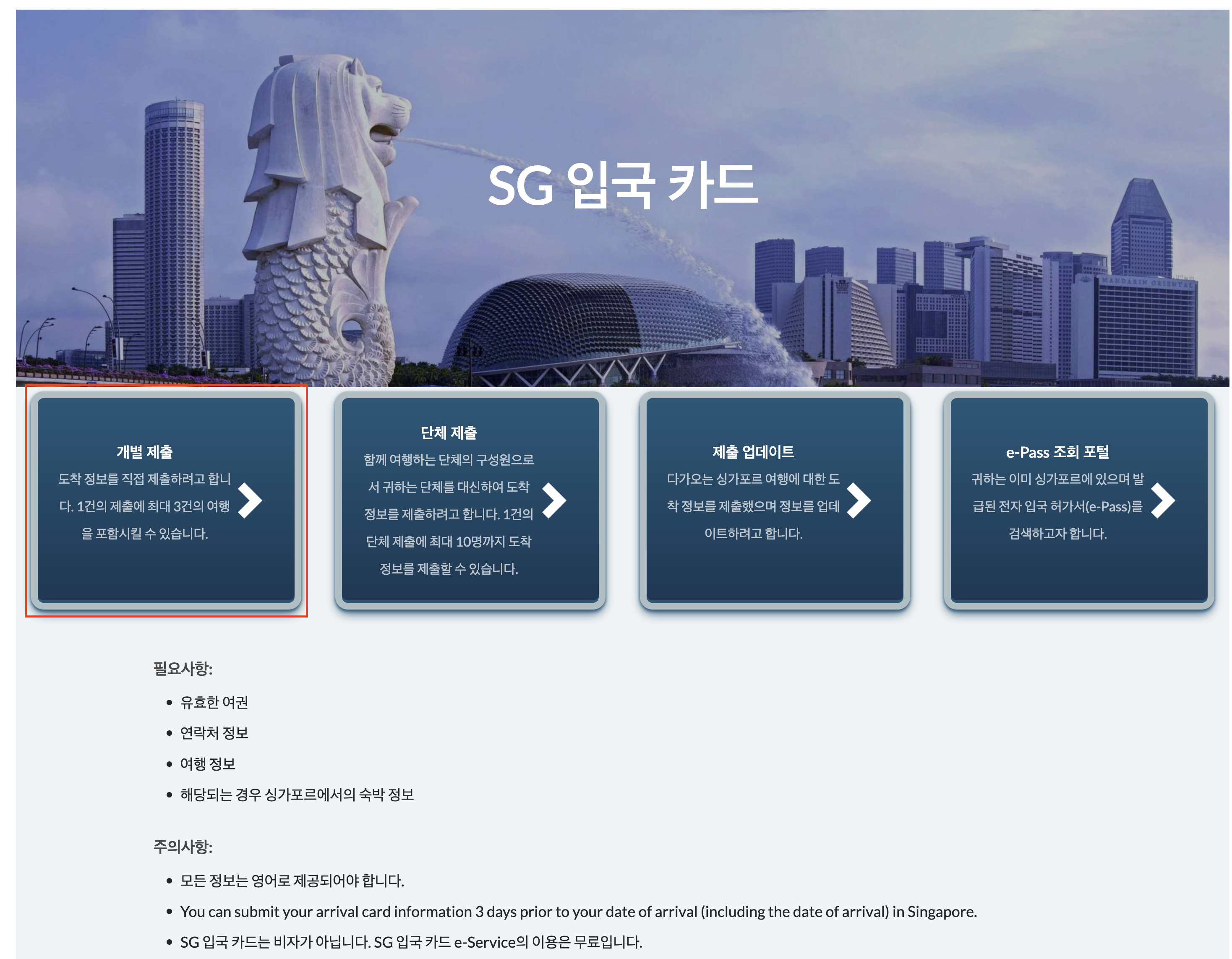 오오 두번째 화면부터는 한국어로 나오니 진행이 수월할 듯 싶다. 먼저 준비물이 안내되어 있는데 유효한 여권, 연락처 정보, 여행 정보, 싱가포르에서의 숙박 정보가 필요하다고 한다. 또한 모든 정보는 영어로 제공되어야 한다고 하니, 입력할 때 주의해야 할 것 같다.