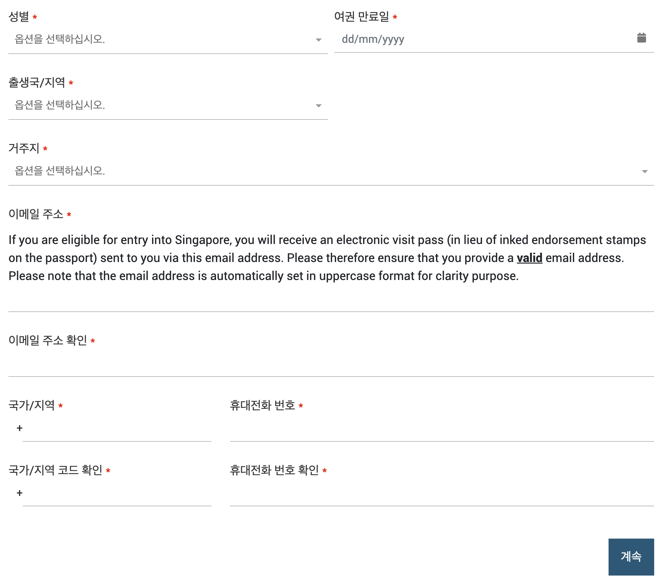 이어서 성별, 여권 만료일, 출생국/지역, 거주지, 이메일 주소 등을 차례로 입력한다. 필수 입력 사항의 경우 빨간색 별표로 표시되어 있는데... 음... 전부 다 필수 정보이다. 의미가 없잖아-_-;