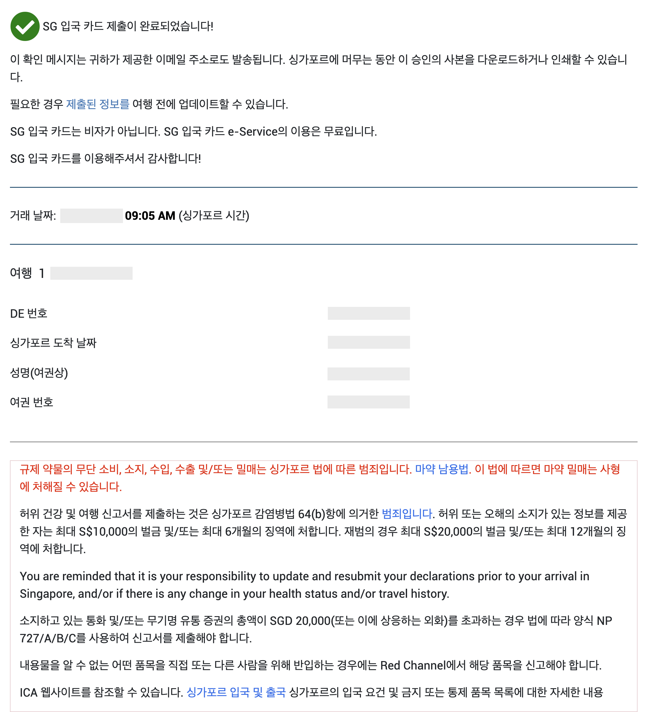 스크롤을 내리니 마약 밀매는 사형에 처해질 수 있다는 붉은색 경고 문구가 보인다. (무서워......) 맞아, 싱가폴은 법이 엄격한 나라였지. 하단 인쇄, PDF 다운로드 버튼이 있는데 동일한 내용이 메일로 발송되었다고 하니 추가로 인쇄를 할 필요는 없을 것 같다.